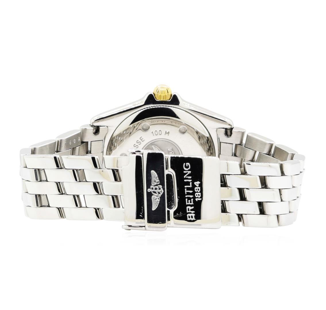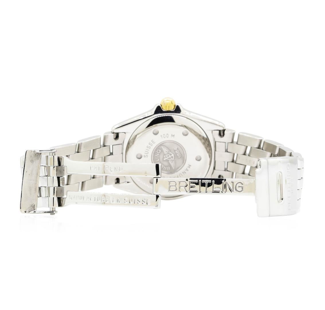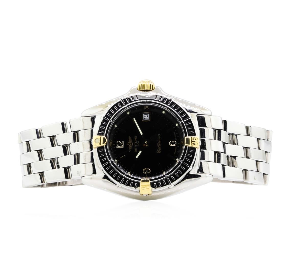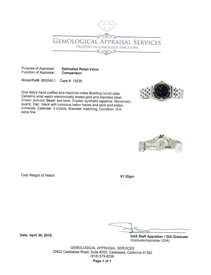 One Ladies, hand crafted and machine milled Breitling round case Callistino wrist watch electronically tested gold and stainless steel, Crown: pull-out, Bezel: two-tone, Crystal: synthetic sapphire, Movement: quartz, Dial: black with luminous baton hands and stick and Arabic numerals, Calendar: 3 o'clock, Bracelet: matching, Condition: G-6 extra fine.. Total Weight of Watch 61.20gm. GAS Appraised.