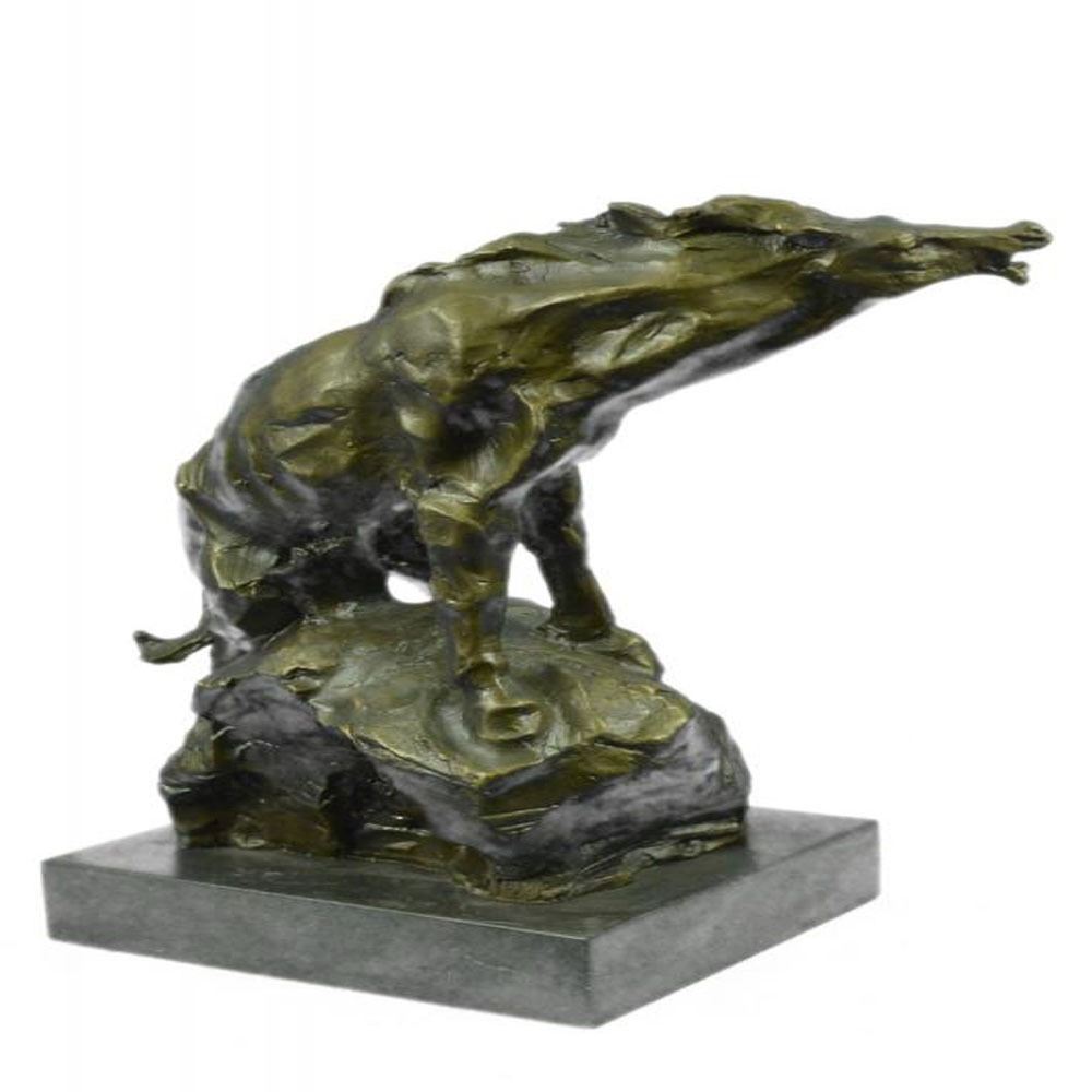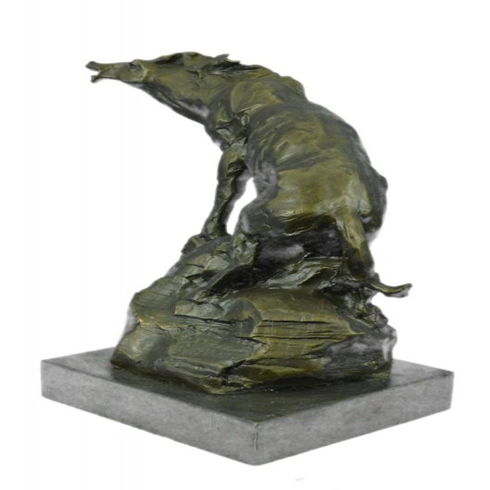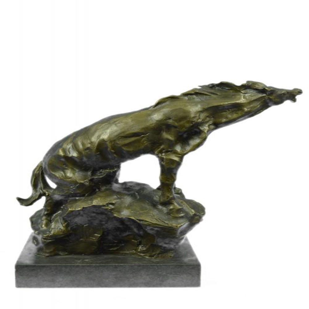 This abstract and modern horse gallops into the wind and rears up letting out a wild neigh as the wind seems pushing against him with a mighty force. This abstract horse captures emotions from the artist and the nature of this wild beast it self. His mane, although not defined, captures the pure energy of movement and shows the force and energy and creativity that is behind this Sculpture. His body has fine linear lines that protrude from his side giving him a unique yet desirable look for the abstract theme. His hind legs mesh in to the base creating the support for the Sculpture. This Sculpture was cast using the Lost Wax Method and has a brown patina. Bronze Dimensions with Marble Base: Height 13 X Width 14 inches. Weight: 20 LBS.