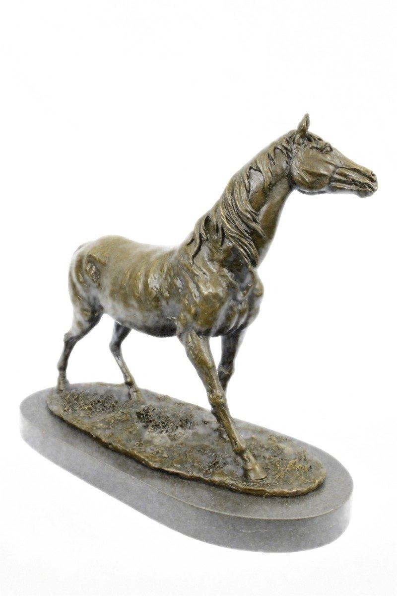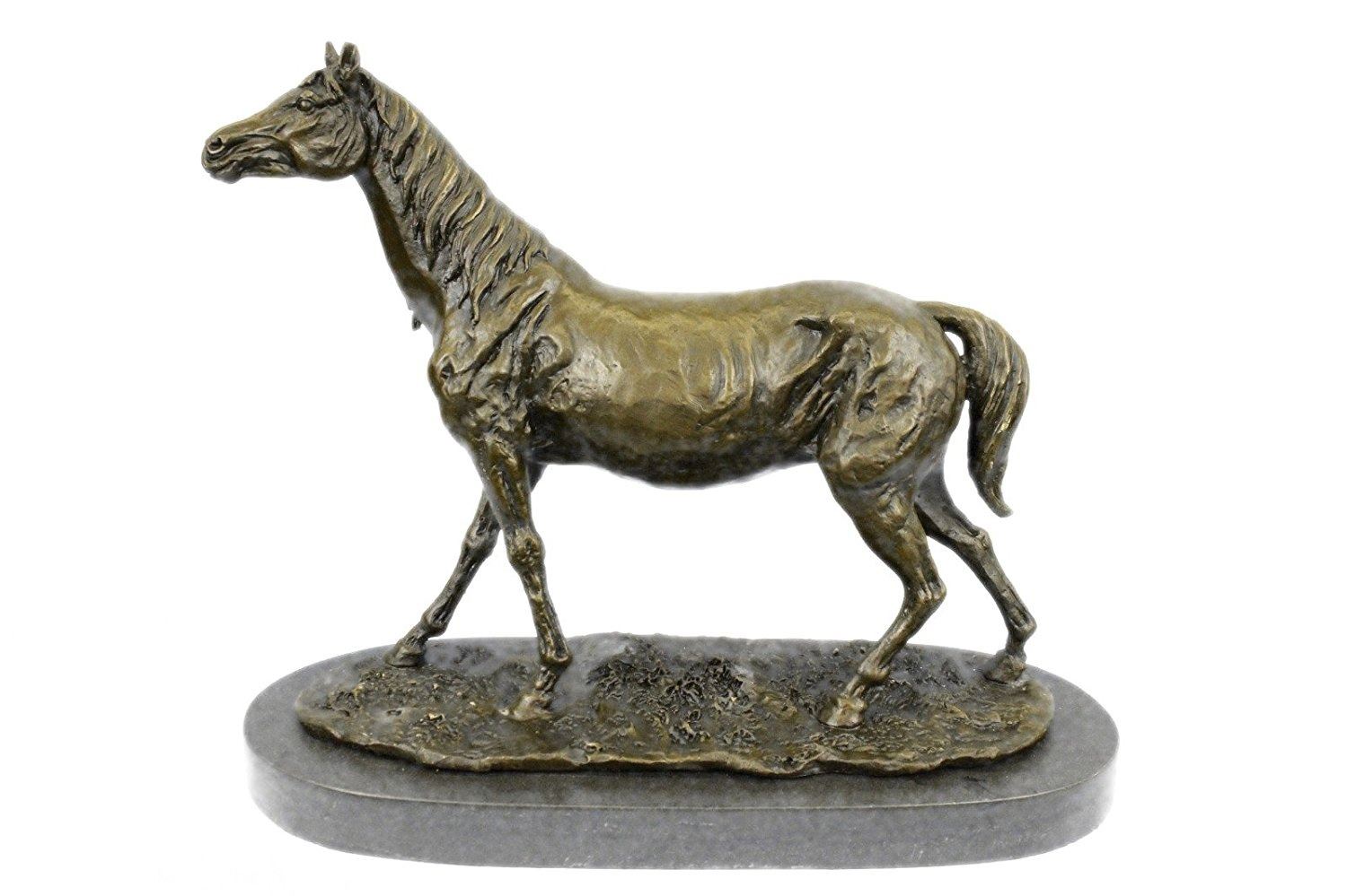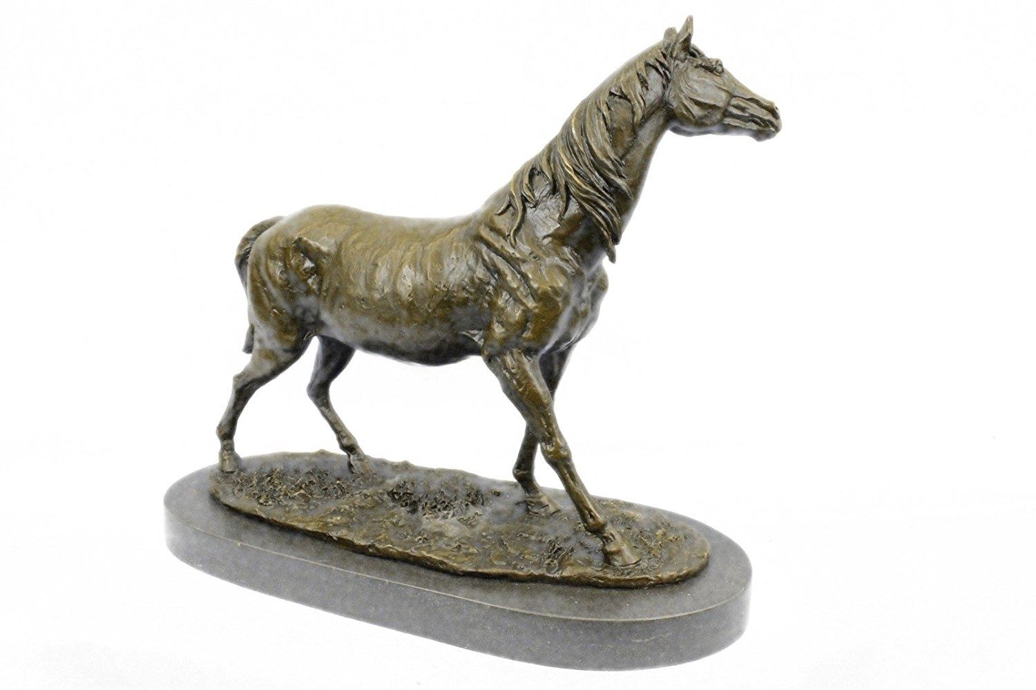 This gorgeous mare takes stroll through the luscious green fields and enjoys the sunny spring day. She is a full bodied girl and her mane is long and flowing. Her Body is muscular and thick. She raises her head and flares her nostrils as she blows out. She is carefree and has not a worry in the world. As her baby foal nibbles on luscious green grass front of her. He follows his mothers every move and eats as much as he can as he is a growing. The base of the sculpture depicts grassy patches indicating she is in a field. This is a perfect gift to give to the animal lover you know. This Bronze Sculpture was casted using the Lost Wax Method and has a two tone brown patina. Bronze Dimensions with Marble Base: Height 13 X Width 16 inches. Weight: 23 LBS. Inventory: 69YRD7297196