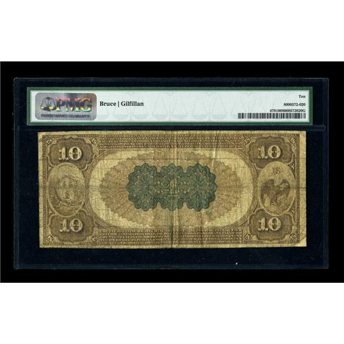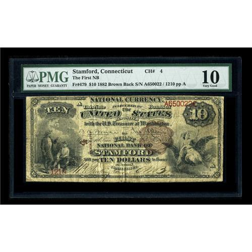 <B>Stamford, CT</B></I> - $10 1882 Brown Back Fr. 479 <B>The First NB</B></I> Ch. # 4<BR>Nice brown-ink pen signatures add to the charm of this $10 from Fairfield County. <B>PMG Very Good 10.</B></I><BR><BR><b>Shipping:</b> Coins & Currency (<a target="_blank" href="http://www.heritageauctions.com/common/shipping.php">view shipping information</a>)