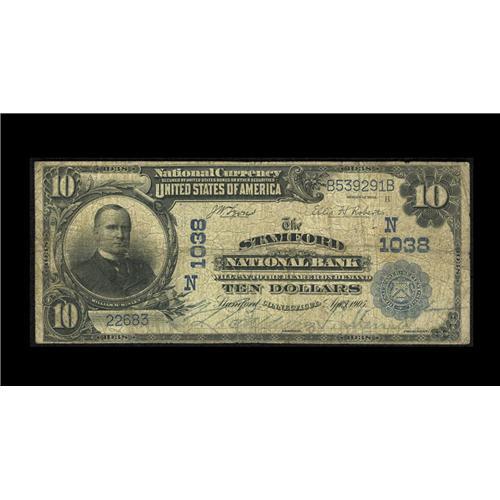 <B>Stamford, CT</B></I> - $10 1902 Date Back Fr. 616 <B>The Stamford NB</B></I> Ch. # (N)1038<BR>Despite an extended life in circulation, this note is nearly intact around the margins and internally. <B>Very Good.</B></I>