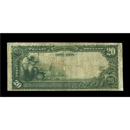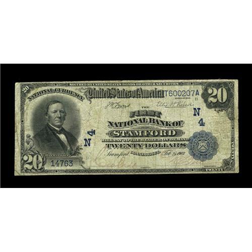 <B>Stamford, CT</B></I> - $20 1902 Date Back Fr. 642 <B>The First NB</B></I> Ch. # (N)4<BR>A very scarce type and denomination from this sought after low charter bank, with this only the second $20 Date Back reported from this institution. <B>Fine,</B></I> with just a bit of soil on the back.