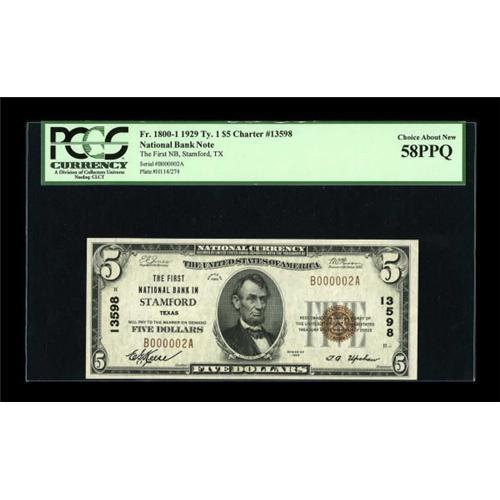 <B>Stamford, TX</B></I> - $5 1929 Ty. 1 <B>The First NB</B></I> Ch. # 13598<BR> A simply lovely example bearing low serial number B000002A. It's been graded <B>Choice About New 58PPQ</B></I> by PCGS, a grade which certainly appears most conservative. <BR><BR><b>Shipping:</b> Coins & Currency (<a target="_blank" href="http://www.heritageauctions.com/common/shipping.php">view shipping information</a>)