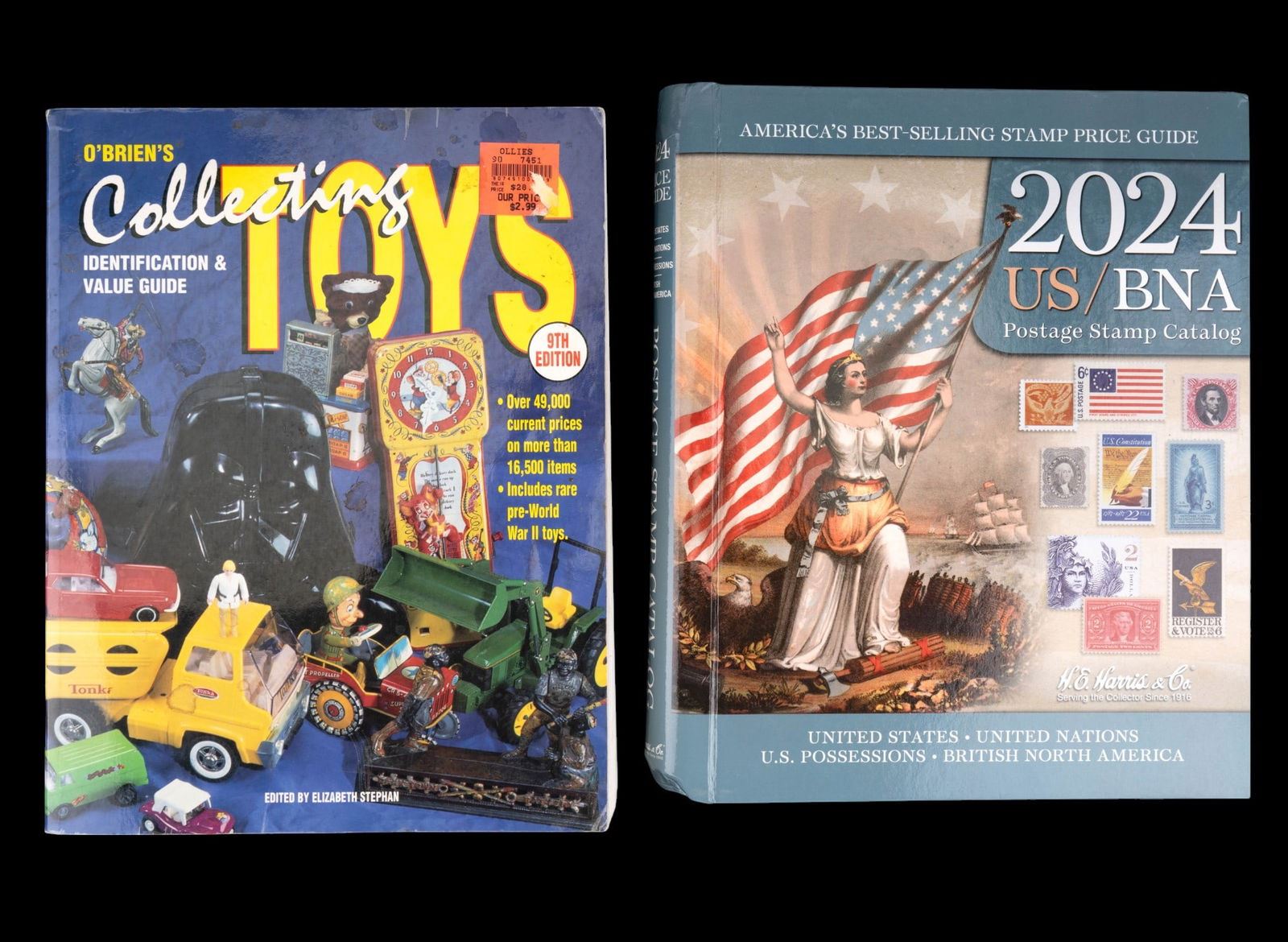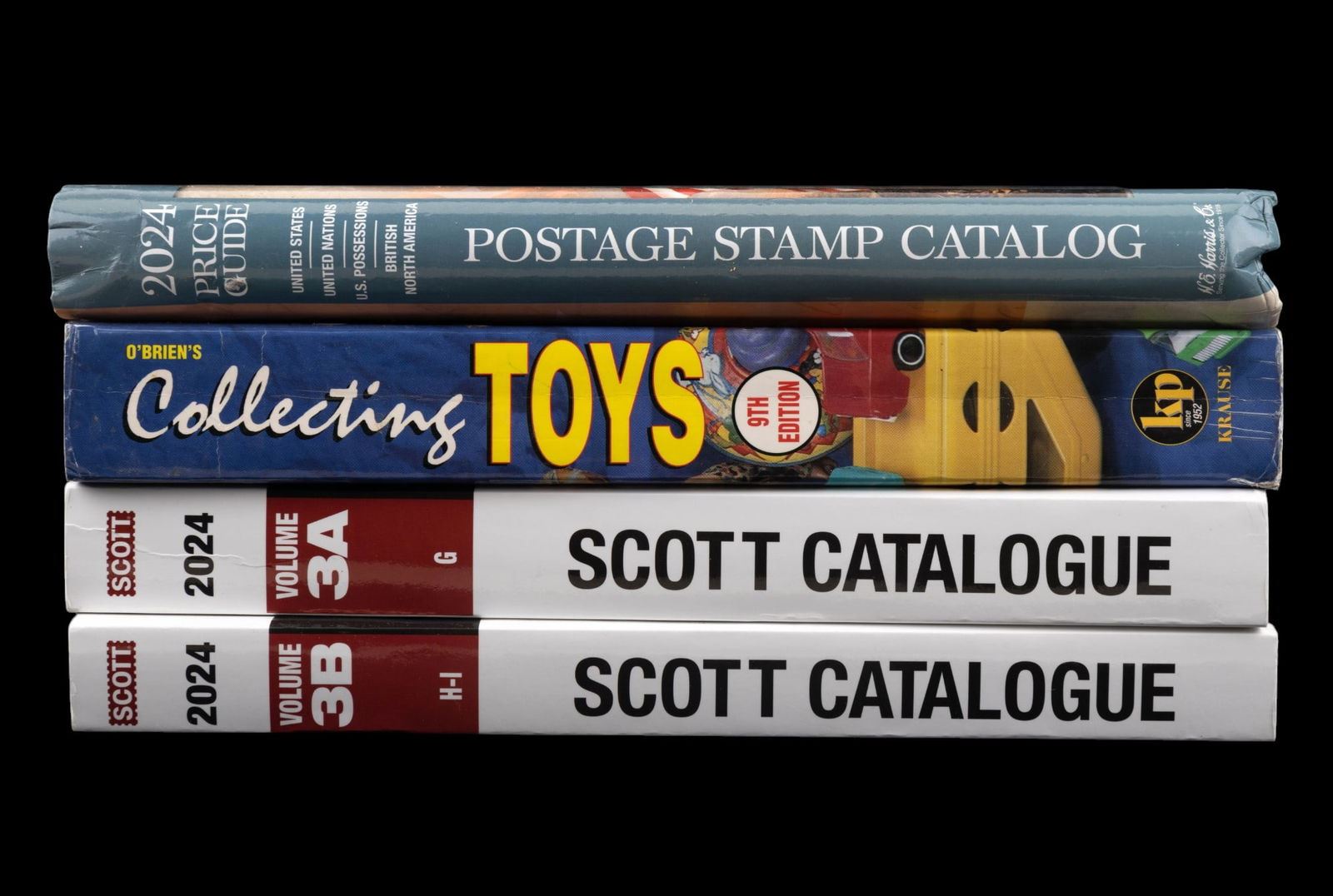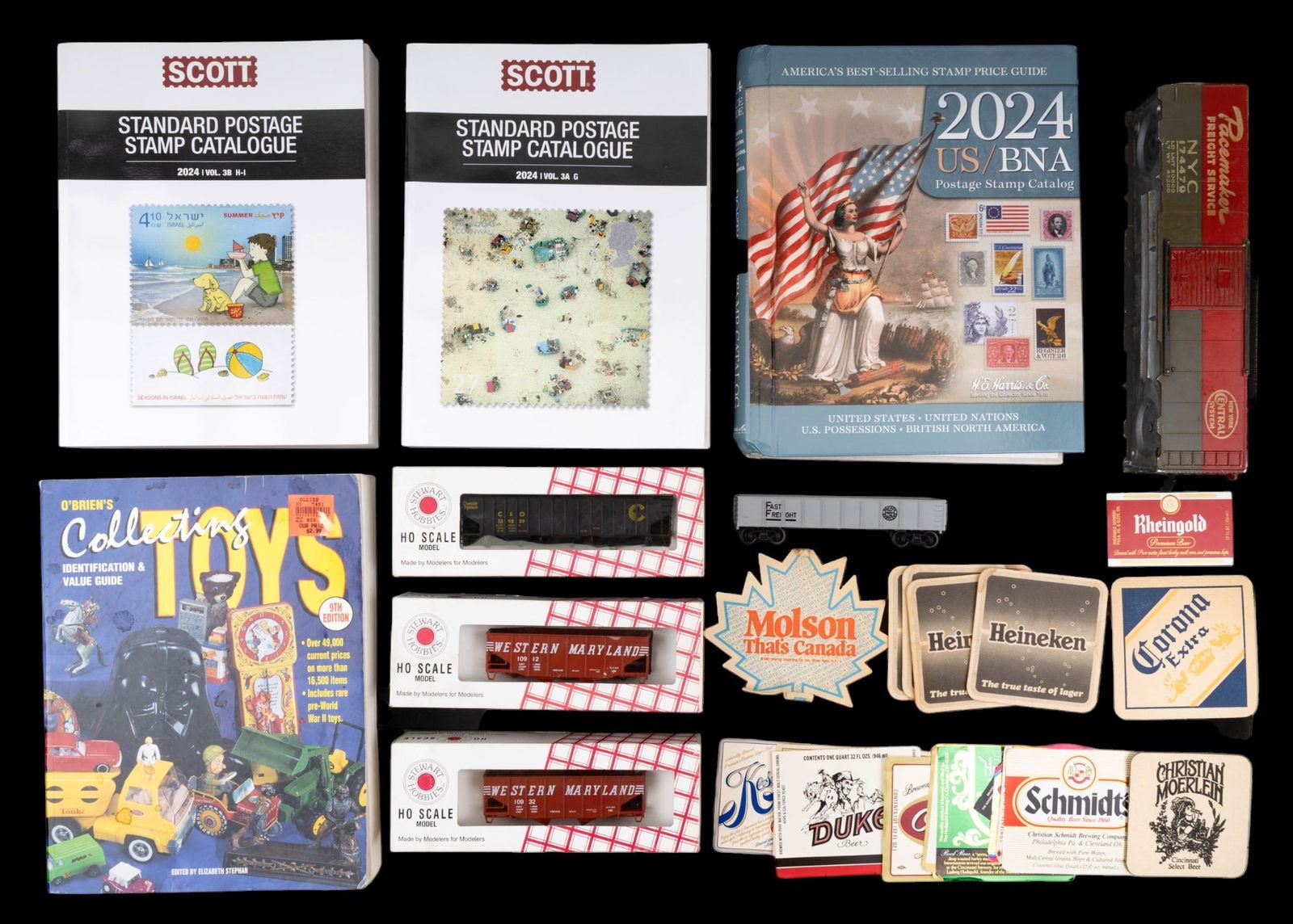 2024 US / BNA Postage Stamp Catalogue, Scott Standard Postage Stamp Catalogue 2024 volumes 3A G & 3B H-I, Stewart Hobbies HO scale boxed Western Maryland hopper cars (2) & C&O hopper car, loose HO scale Fast Freight gondola car, loose New York Central O scale railroad car, O'Brien's / collecting Toys 9th Edition Identification & Value Guide, & assortment of 30 beer labels & coasters.