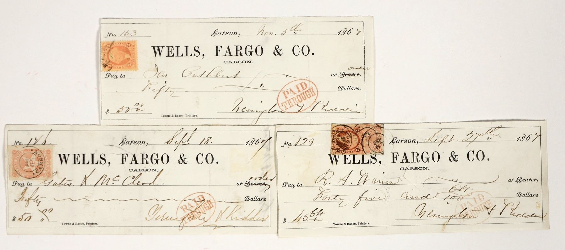 Lot of 3 different forms of stamp use on early Carson checks. Note that the Nevada adhesive revenue stamp only carries the word Carson in the cancel. The words Wells Fargo were not added. Two are on orange Nevada adhesive stamps.