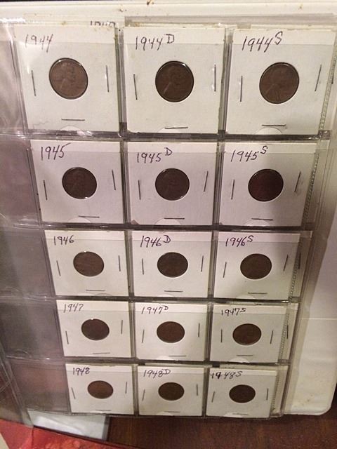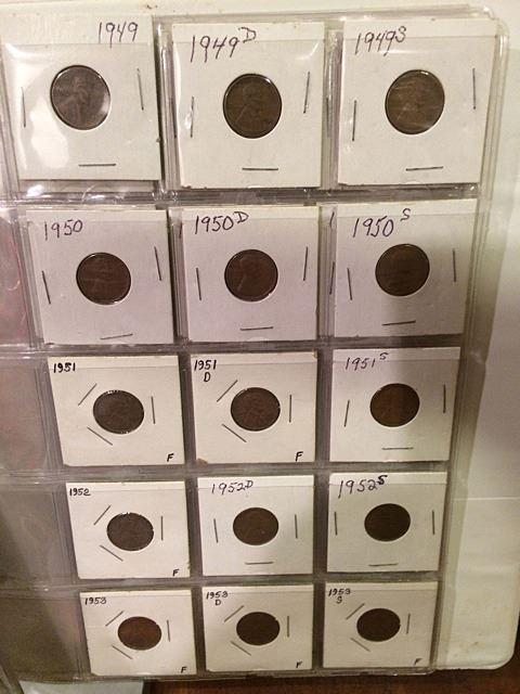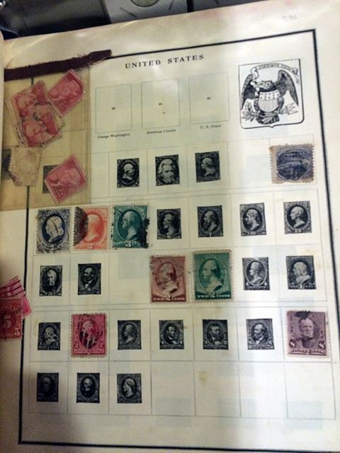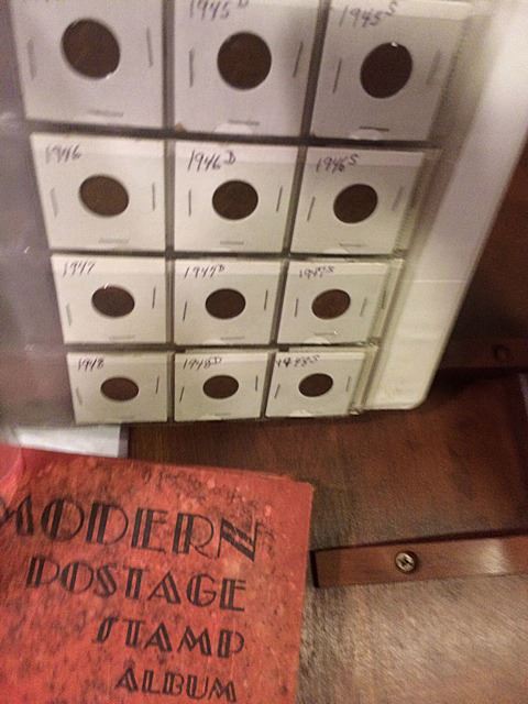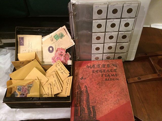 Estate stamp collection includes book of stamps and envelopes filled with stamps, 1st day covers, and binder book of pennies dates 1930s-1950s.