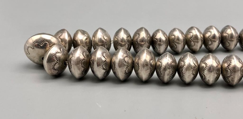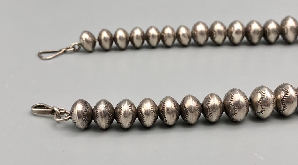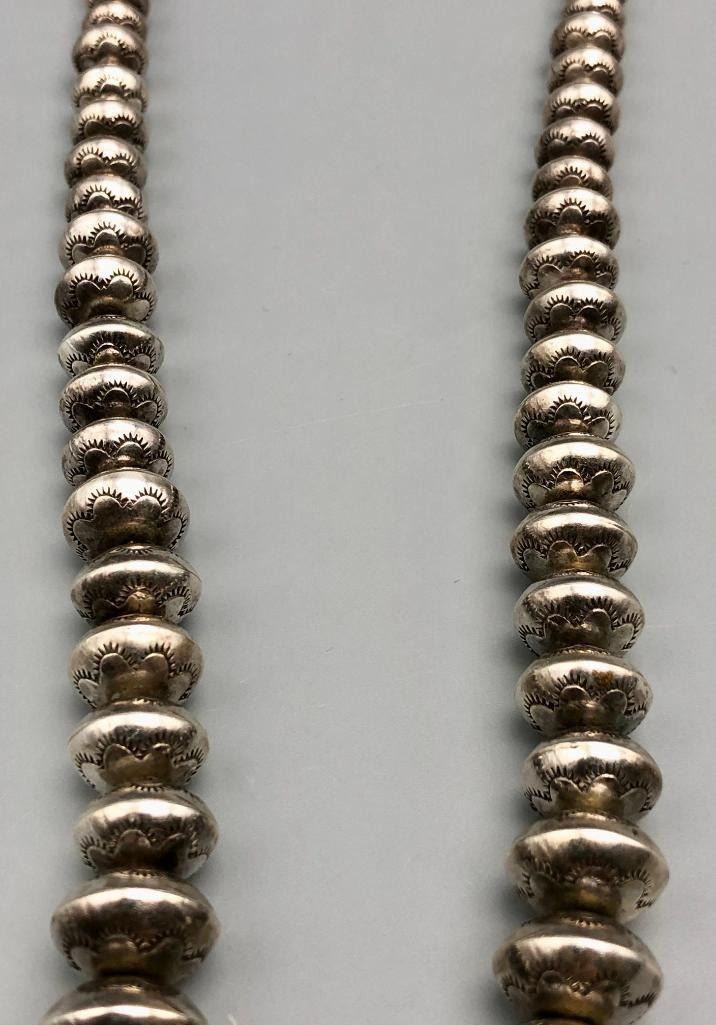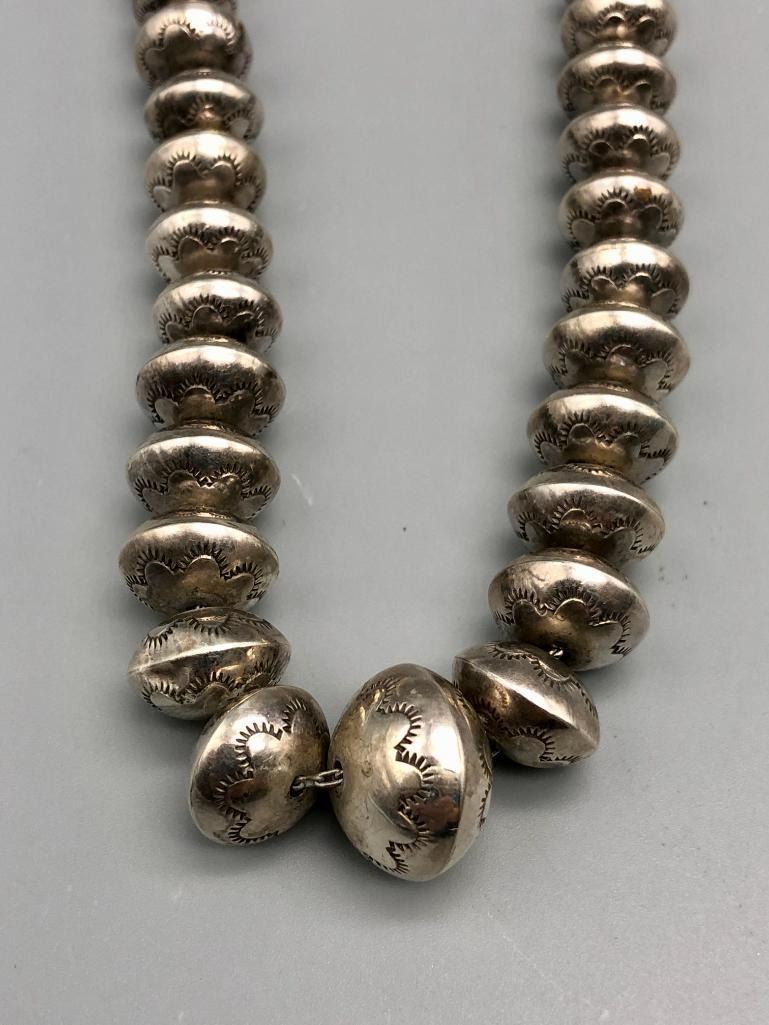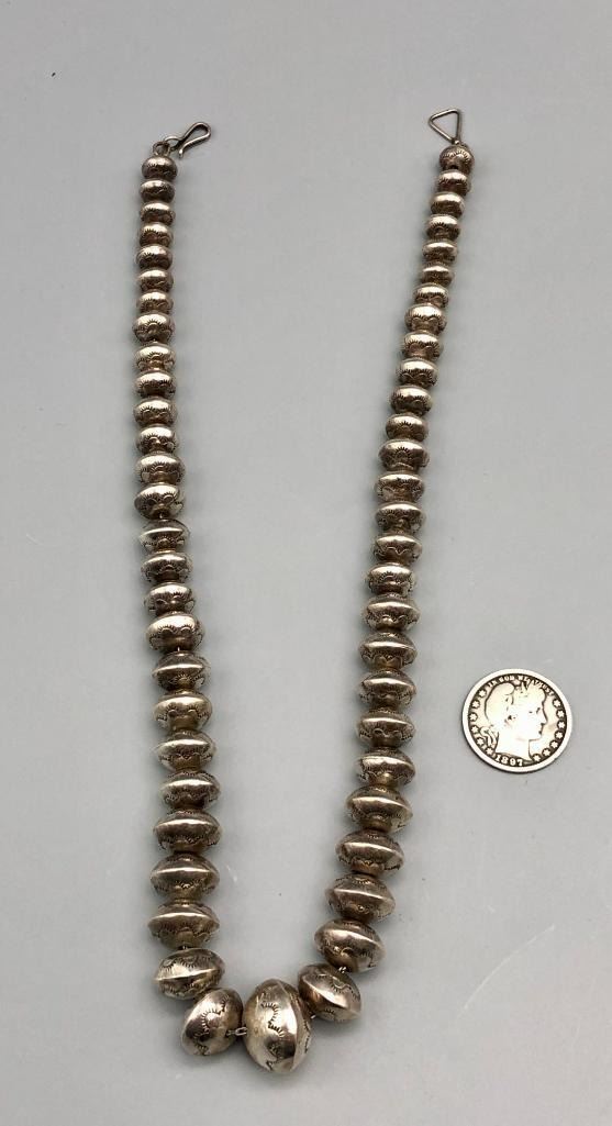 Up for consideration in this lot is a stamped Navajo pearl necklace. This is a fabulous necklace with graduated beads that are accented with hand stamped designs. It is strung on a fine chain and made from sterling silver. MAKER: Unmarked. APPROX AGE: Circa 1970s. SIZE: Fits a 18 inch neck. Weighs 75.4 grams. CONDITION: Good for its age, normal wear expected. Please look closely at the pictures as they are an important part of our description and are hereby incorporated into the description, specifically with regards to condition. SHIPPING: There will be a $5 handling / packaging fee for shipping this lot. The actual cost of postage will be added on top of that. BUY IT NOW: If you would like to buy this item now, without waiting for the auction day to bid on it, we do offer this option (which is available up to 48 hours before the actual auction starts). The “Buy it Now†price is the high estimate of this lot (plus applicable fees and the Buyer's premium is discounted to 10% when using the Buy it Now option). If you would like to exercise this option, you must contact us by email (or phone as long as you talk to someone live). Reference this lot number and your intention to "Buy it Now."