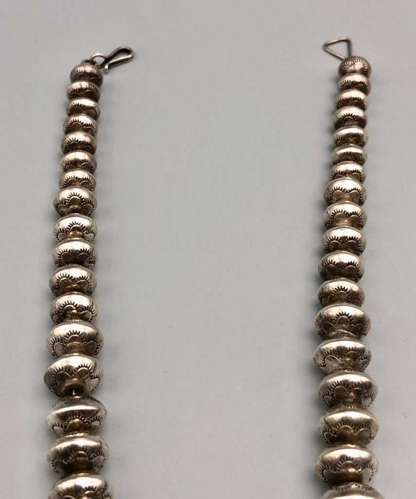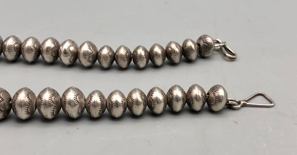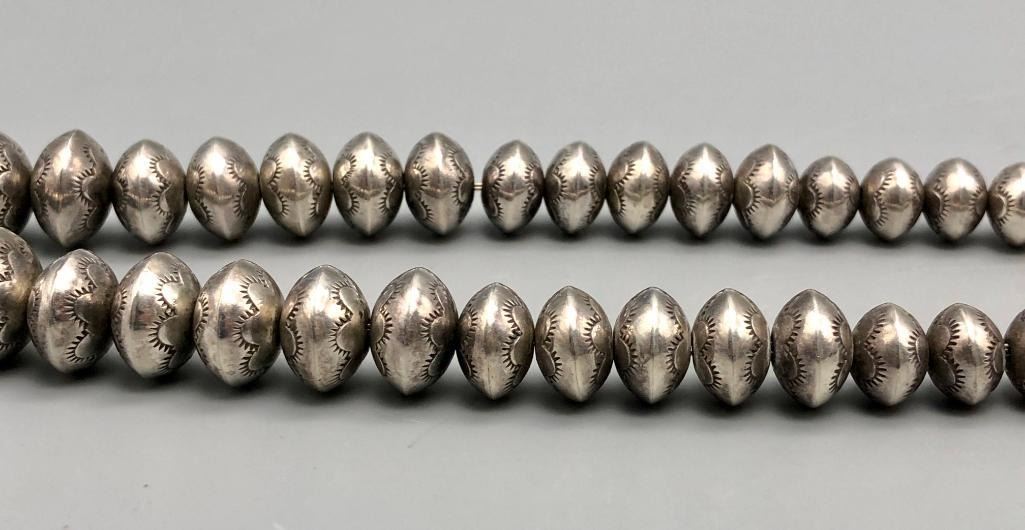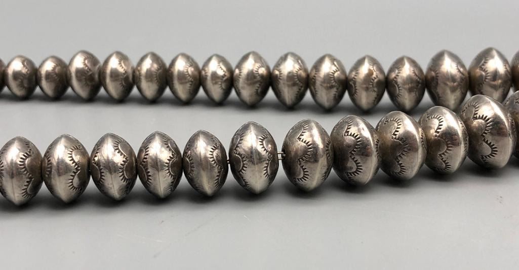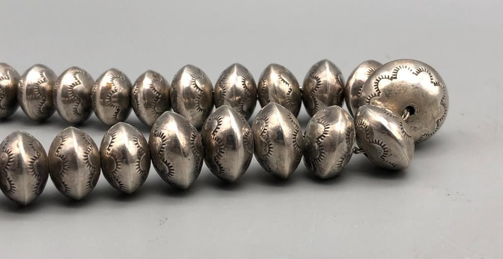Up for consideration in this lot is a stamped Navajo pearl necklace. This is a fabulous necklace with graduated beads that are accented with hand stamped designs. It is strung on a fine chain and made from sterling silver. MAKER: Unmarked. APPROX AGE: Circa 1970s. SIZE: Fits a 18 inch neck. Weighs 75.4 grams. CONDITION: Good for its age, normal wear expected. Please look closely at the pictures as they are an important part of our description and are hereby incorporated into the description, specifically with regards to condition. SHIPPING: There will be a $5 handling / packaging fee for shipping this lot. The actual cost of postage will be added on top of that. BUY IT NOW: If you would like to buy this item now, without waiting for the auction day to bid on it, we do offer this option (which is available up to 48 hours before the actual auction starts). The “Buy it Now†price is the high estimate of this lot (plus applicable fees and the Buyer's premium is discounted to 10% when using the Buy it Now option). If you would like to exercise this option, you must contact us by email (or phone as long as you talk to someone live). Reference this lot number and your intention to "Buy it Now."