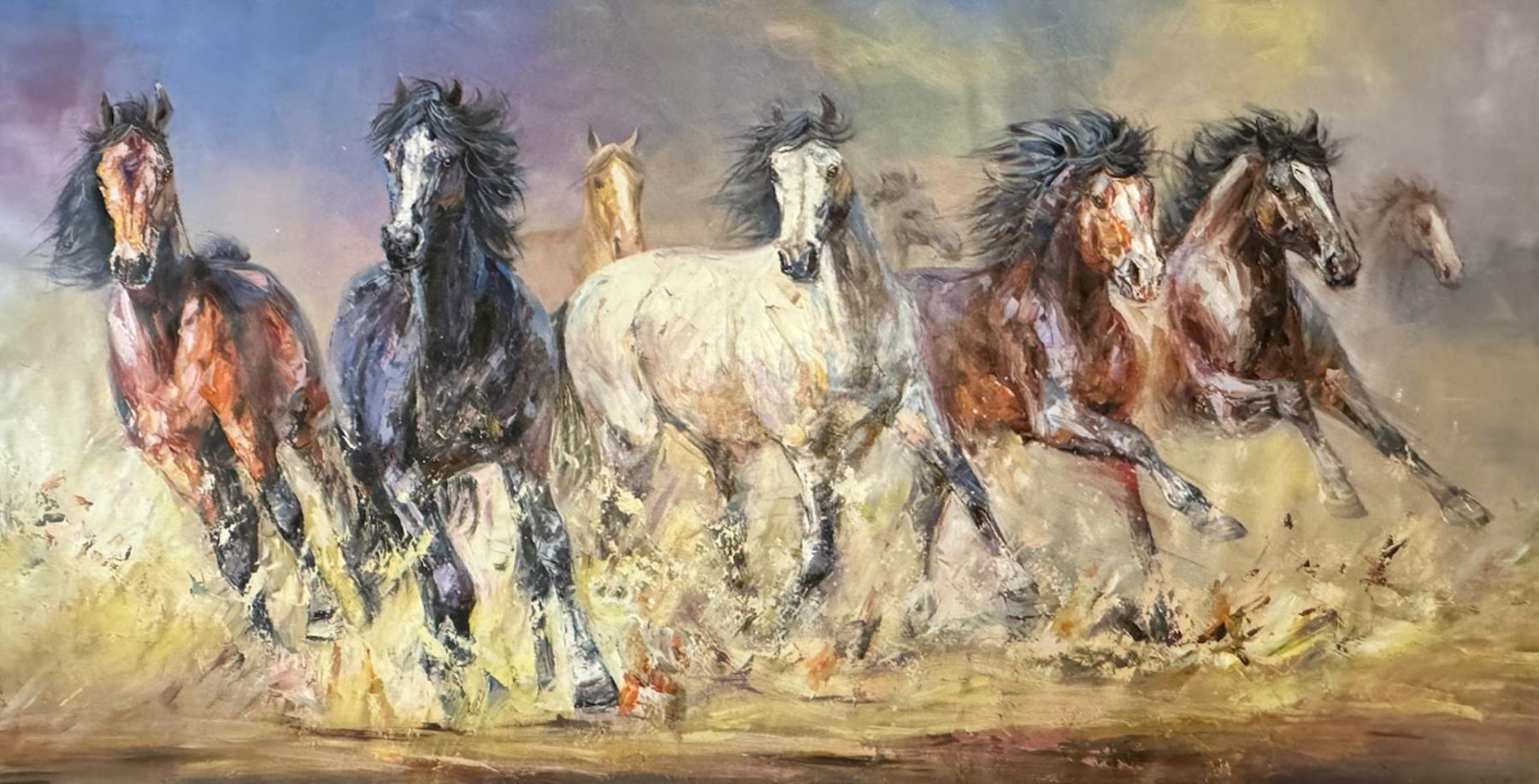 A small group of horses run through a stream by Inam. - Oil on Canvas 40x80 w/COA
