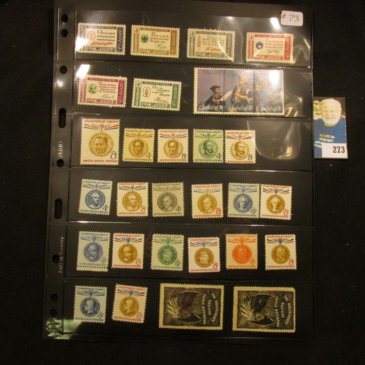 Stamps - Scott # 1139-1144 Set of 6 American Credo Issue mint, Scott # 1629-1631 set of 3 Spirit of 76 mint stamps, Set of 19 different MNH Champions of Liberty from yrs 1957-1960, side 2 - 6 cancelled buffalos Scott #569, 6 pre-cancelled #565, Indians-both from yr 1923, 6 cancelled #702 Red Cross. Yr 1931, Scott #1055 3 Coil Line Prs MNH, 4 diff postal notes from 1945-51