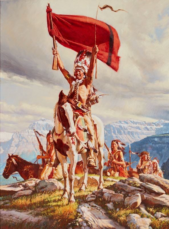 To the unaided eye, this piece appears to be in good condition. Inspection under ultraviolet light reveals a normal fluorescence of the artist's pigments. There are no signs of restoration. There is a stretcher bar impression in the canvas along the upper edge and two drips marks extending downward from the upper center of the piece that have left a slight discoloration. The piece is framed in a pale rustic wooden frame with a gold inner rim and a linen liner. The frame is in good condition with normal signs of wear. The liner has some discoloration. Plate: A Sign of Vistory, Stan Davis Verso: [sticker attached to backing] A Sign of Vistory; Attention, A year from purchase date it is suggested that this painting be cleaned and a final Damar varnish be applied by a reputable restorer or frame shop.