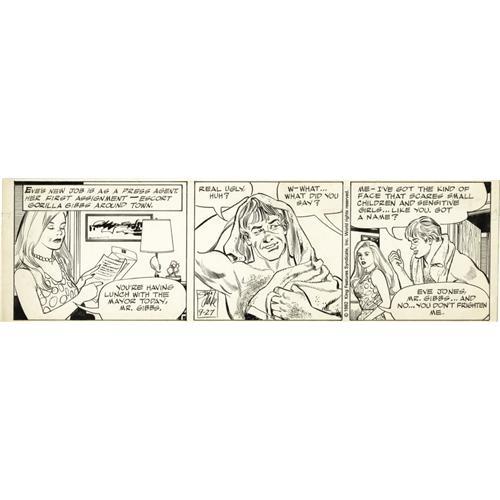 <B>Stan Drake - Heart of Juliet Jones Daily Comic Strip Original Art, dated 9-27-82 (King Features, 1982).</B></I> Stan Drake definitely had a way of drawing fetching beauties, as this three-panel daily showcasing Eve Jones amply demonstrates. This daily has an image area that measures 15" x 4.25", and the art is in Excellent condition. <BR><BR><B>Important notice:</B> Heritage usually auctions material at the rate of 200-250 lots per hour. On some occasions eBay Live bid software or the Internet may not be able to keep up with the pace of the auction. We recommend placing a realistic absentee bid now as insurance to avoid disappointment. Occasionally the auctioneer may eliminate or reject an eBay Live bid, and the auctioneer may also reopen a lot after the close of the eBay live bidding (usually because we missed an audience bid), and may reject your bid even if it shows you as the winning bidder. By bidding via eBay Live, you agree that Heritage may award the lot to another bidder at its sole discretion under the circumstances described above or any other reasonable circumstances. Since eBay bids are not shown to us until we open the lot on the floor, we treat those bids just like floor bids. In most cases the floor responds before the eBay bid is presented to us, due to Internet lag time, so for consistency we have made it a policy that floor bids are always considered first over tie eBay live bids. Also please note that all Heritage lots purchased through eBay Live carry a 22.5% Buyer's Premium. Please make sure you read the Terms and Conditions before you bid. This lot is being auctioned in conjunction with a live floor auction by Heritage Auction Galleries. All final auction and invoice information will be supplied by Heritage Auction Galleries, and all other information should be considered preliminary. Lot:41001 <BR><BR><B>Winning Notification and Billing:</B> After the FINAL session in this auction is complete, Heritage will send e-mail and snail mail invoices. This process normally takes several days. All final auction and invoice information will be supplied by Heritage Auction Galleries, and all other information should be considered preliminary. <BR><BR>This auction will be conducted on a live auction floor and over the Internet through eBay Live. If you choose to place an absentee bid, please take a moment to <font color='#0000ff'><u><a href='http://pages.ebay.com/liveauctions/help/before/laabsentee.html'>learn how eBay Live absentee bidding works</a></u></font><font color='#000000'>