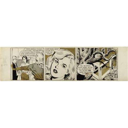 <B>Stan Drake - Heart of Juliet Jones Daily Comic Strip Original Art, dated 3-23-61 (King Features Syndicate, 1961).</B></I> Lovely Juliet and Eve Jones star in this episode. This strip has an image area of 18" x 5.25", and aside from yellowed Zipatone, the art is in Very Good condition. <BR><BR><b>Shipping:</b> Flat Material, Small (<a target="_blank" href="http://www.heritageauctions.com/common/shipping.php">view shipping information</a>)
