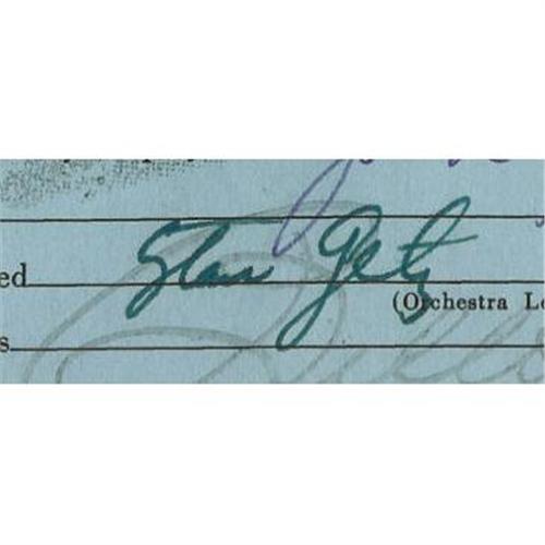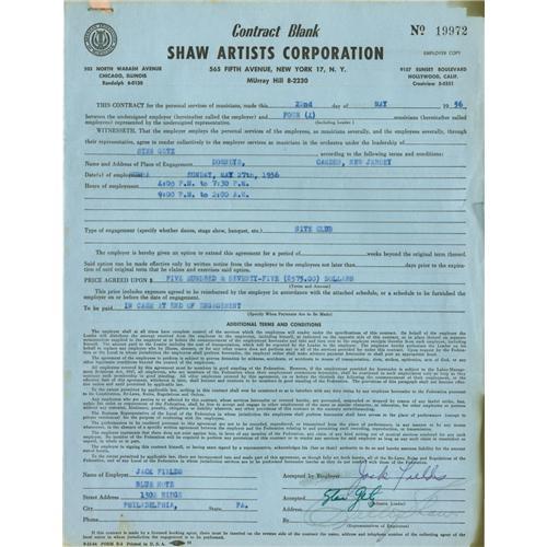 <B>Stan Getz Signed Contract.</B></I> A Shaw Artists contract dated May 22, 1956, engaging Getz to perform at Downey's in Camden, New Jersey, signed by him in green ink. In Very Fine condition with some discoloration to the corners.<I>Accompanied by LOA from PSA/DNA.</B></I><BR><BR><b>Shipping:</b> Flat Material, Small (<a target="_blank" href="http://www.heritageauctions.com/common/shipping.php">view shipping information</a>) <BR><BR><B>Important noti