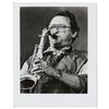 Glossy 8 x 10 photo of Getz playing his tenor saxophone, signed in black felt tip, "Sincerely, Stan Getz." In very fine condition.