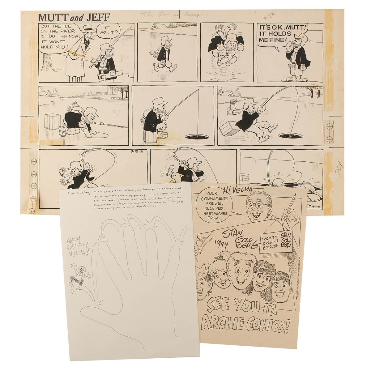Original hand-inked eight-panel Mutt and Jeff Sunday comic strip on a 22 x 14 sheet of artist’s cardstock, dated March 12, 1961. Strip depicts Jeff’s attempt to ice fish and is signed in the last panel in black ink, “Al Smith”; an original signed and inscribed ballpoint sketch of Goldberg’s traced right hand, with Goldberg adding a self-portrait, at the bottom of a fan letter to Goldberg on a 9 x 12 off-white sheet; and a printed sketch of the Archie characters on a beige 8.5 x 11 sheet, signed and inscribed in black felt tip by Goldberg. In overall very good to fine condition, with expected notations and borders affixed to edges and scattered light toning and foxing to strip.