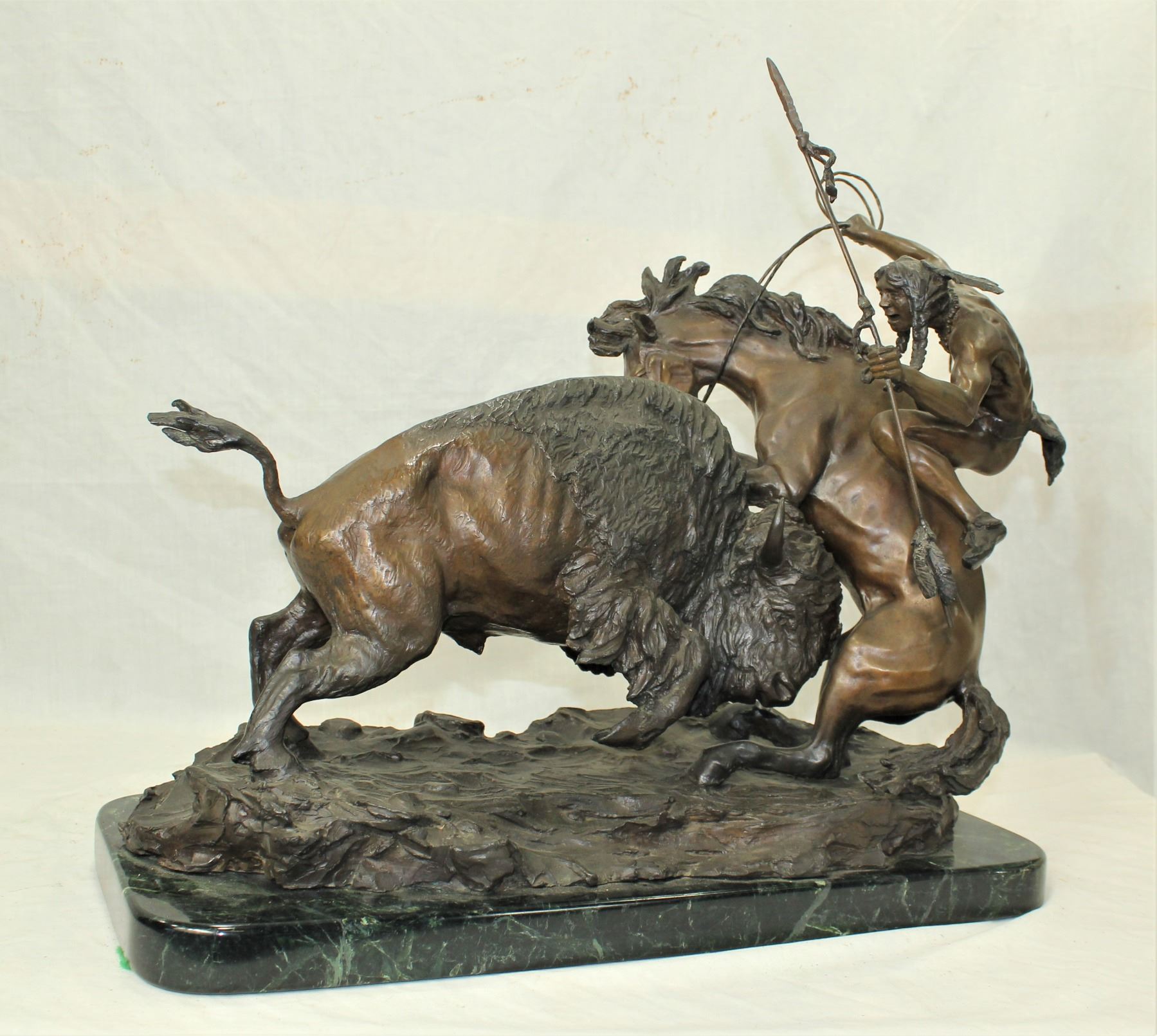 Large nicely accomplished bronze depicting a horseback Indian being charged by a buffalo during the hunt. Numbered 13 of 40, dated 1976, and measuring 18"tall x 24"wide x 11" deep. Mounted on marble pith.