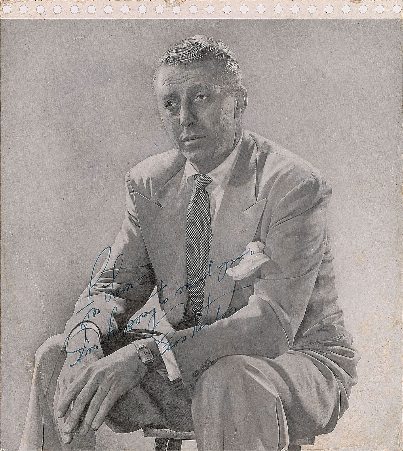 Uncommon 12 x 13.25 spiral-bound book photo of the acclaimed pianist and band leader seated on a stool and wearing a handsome suit, signed and inscribed in fountain pen, "For Leon—I'm happy to meet you, Stan Kenton.” In fine condition, with some light staining to the edges. The photo was one of 32 included in the Mercury Records 1949 box set The Jazz Scene.