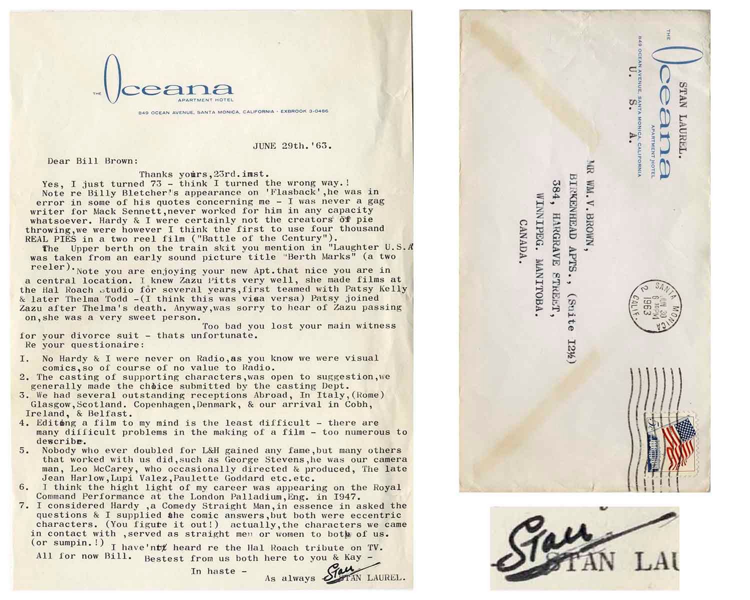 Stan Laurel typed letter signed, dated 29 June 1963, with great content regarding the Laurel & Hardy comedic duo. Laurel writes to his friend Bill Brown, in part, ''...Yes, I just turned 73 - think I turned the wrong way!...Hardy & I were certainly not the creators of pie throwing, we were however I think the first to use four thousand REAL PIES in a two reel film ('Battle of the Century'). The Upper berth on the train skit you mention in 'Laughter U.S.A.' was taken from an early sound picture title 'Berth Marks' (a two reeler)...'' Laurel then laments about the passing of Zazu Pitts (''a very sweet person'') before answering questions about Laurel & Hardy: ''No Hardy & I were never on Radio, as you know we were visual comics, so of course no value to Radio...Many others that worked with us [achieved fame], such as...the late Jean Harlow, Lupi Valez, Paulette Goddard etc...I think the hight light [sic] of my career was appearing on the Royal Command Performance at the London Palladium, Eng. in I947...I considered Hardy, a Comedy Straight Man, in essence in asked the questions & I supplied the comic answers, but both were eccentric characters. (You figure it out!) actually, the characters we came in contact with, served as straight men or women to both of us (or sumpin!)...[signed] Stan''. Single page letter on Oceana stationery measures 7.25'' x 10.5''. Folds and light toning, else near fine. With original envelope.