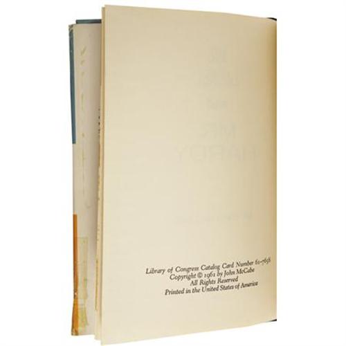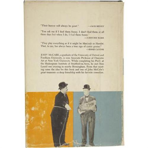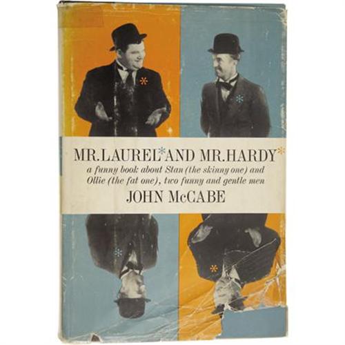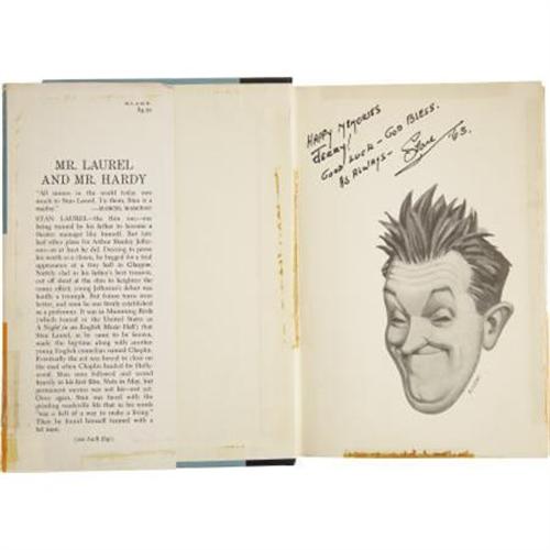 <B>Stan Laurel Signed Biography.</B></I> A first edition copy of <I>Mr. Laurel and Mr. Hardy,</B></I> John McCabe's 1961 biography on the comedy duo, inscribed and signed by Stan Laurel in black ink on the first free endpaper, which has a caricature of him printed on it. In Very Fine condition with mild wear and tanning to the book and moderate wear, creasing, tearing, and a few tape repairs to the dustjacket, none of which affects the autograph.<BR><BR><b>Shipping:</b> Books & Catalogs (<a target="_blank" href="http://www.heritageauctions.com/common/shipping.php">view shipping information</a>)