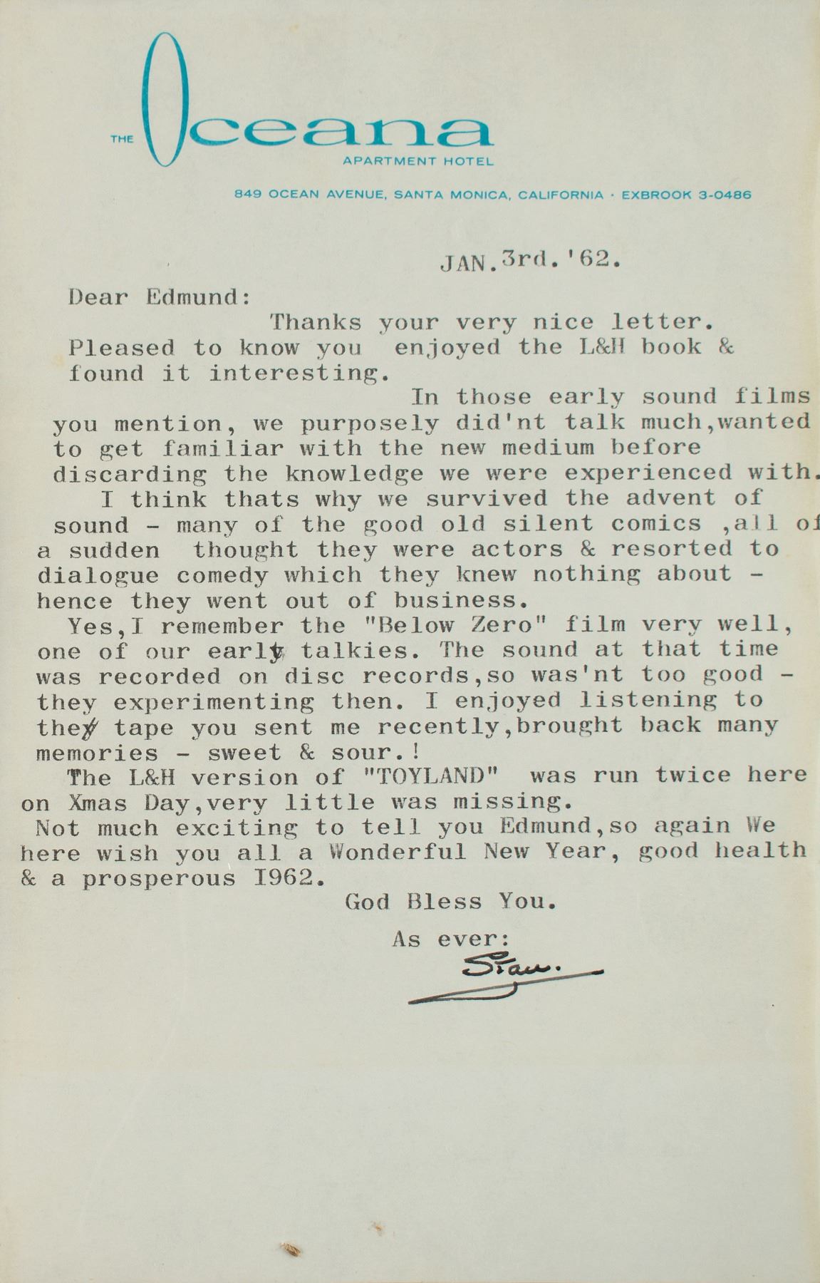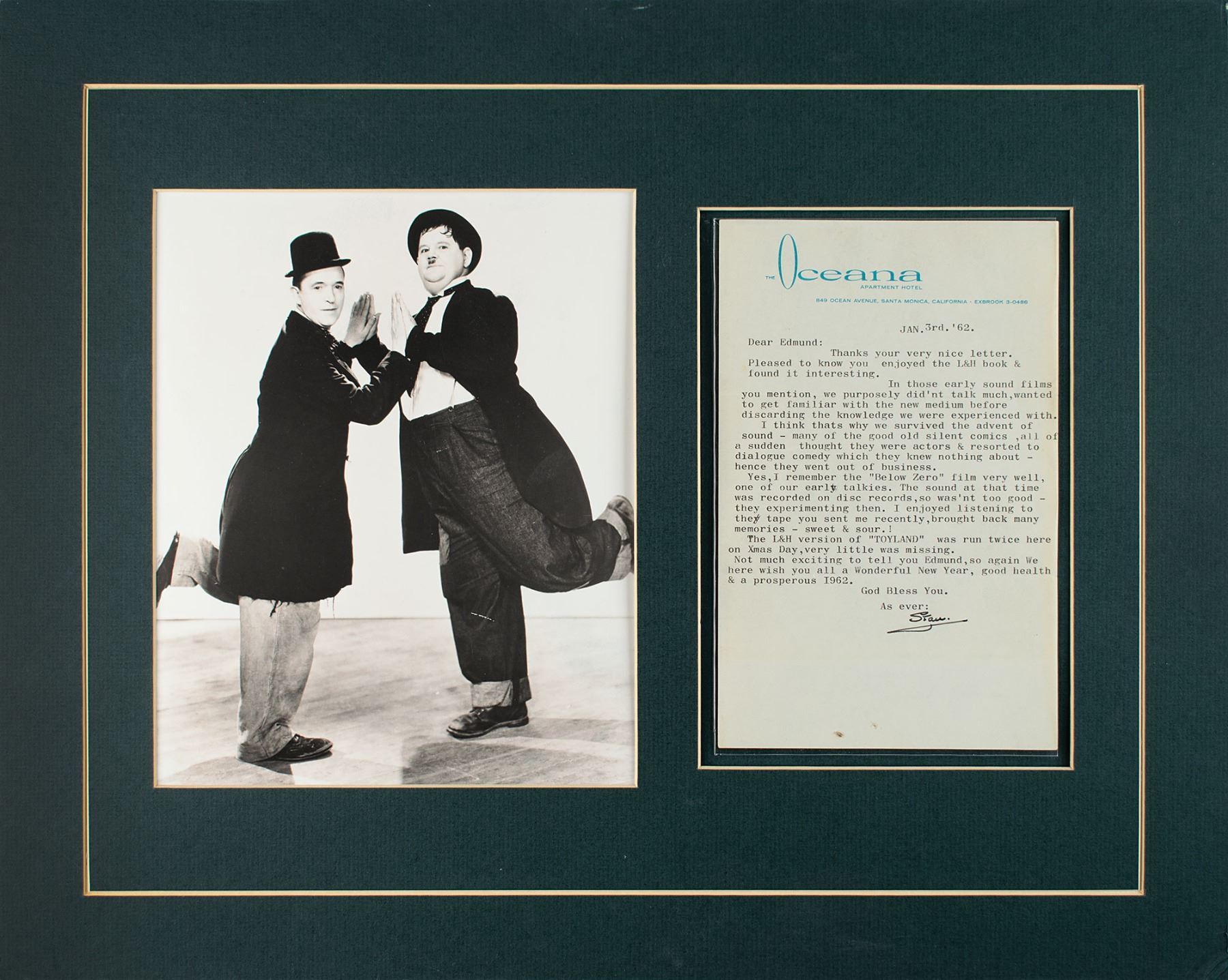 TLS signed “Stan,” one page, 5.5 x 8.5, Oceana Hotel letterhead, January 3, 1962. Letter responding to the reader of a Laurel & Hardy book, in part: "In those early sound films you mention, we purposely didn't talk much, wanted to get familiar with the new medium before discarding the knowledge we were experienced with. I think that's why we survived the advent of sound—many of the good old silent comics all of a sudden thought they were actors & resorted to dialogue comedy which they knew nothing about—hence they went out of business. Yes, I remember the 'Below Zero' film very well, one of our early talkies. The sound at that time was recorded on disc records, so wasn't too good…The L&H version of 'Toyland' was run twice here on Xmas Day, very little was missing." Nicely matted with a portrait of the famous comedy duo to an overall size of 20 x 16. In fine condition.