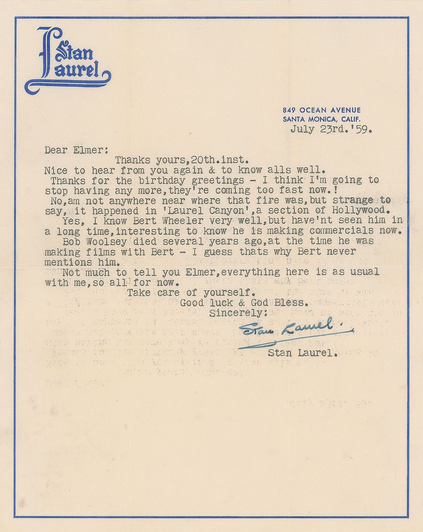 TLS, one page, 8 x 10, personal letterhead, July 23, 1959. Letter to Elmer Westover, in part: "Thanks for the birthday greetings—I think I'm going to stop having any more, they're coming too fast now! No, am not anywhere near where that fire was, but strange to say, it happened in 'Laurel Canyon,' a section of Hollywood. Yes, I know Bert Wheeler very well, but haven't seen him in a long time, interesting to know he is making commercials now. Bob Woolsey died several years ago, at the time he was making films with Bert—I guess that's why Bert never mentioned him." In fine condition. Accompanied by the original mailing envelope.