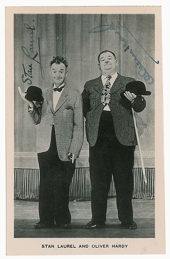 Vintage matte-finish 3.5 x 5.5 promotional photo of the comedic duo standing side-by-side with their bowler hats, signed in fountain pen, "Stan Laurel" and "Oliver Hardy." In fine condition, with a few very light bends.