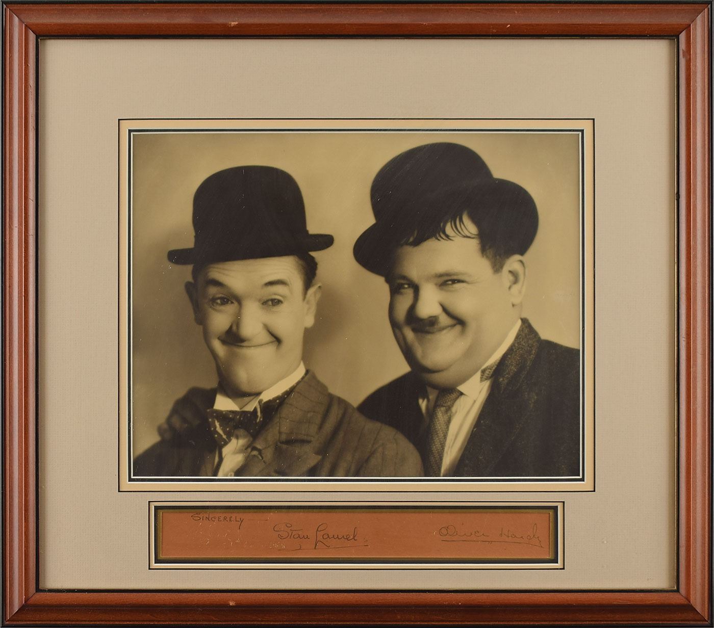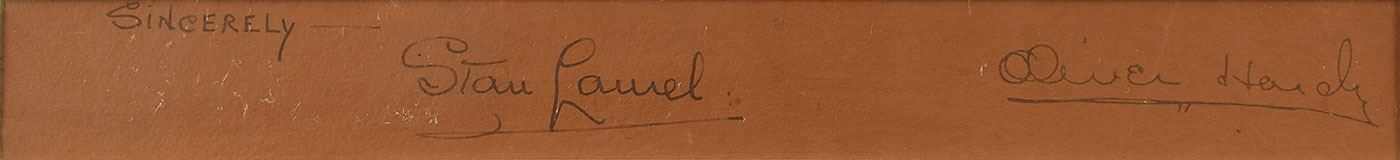 Vintage fountain pen signatures, "Sincerely—Stan Laurel" and "Oliver Hardy," on a beige 11.25 x 1.25 sheet. Triple-matted and framed with a large photo of the sidekick comedians to an overall size of 20.75 x 18.25. In fine condition.
