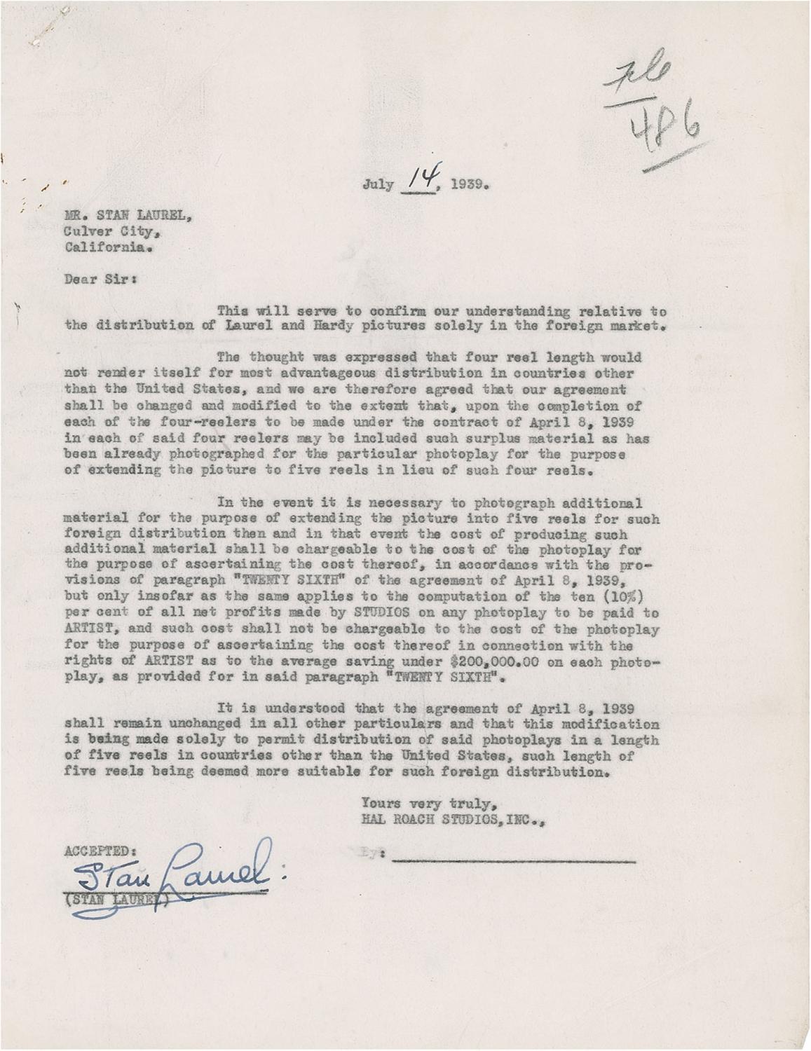 DS, one onionskin page, 8.5 x 11, July 14, 1939. Agreement between Hal Roach Studios and Stan Laurel regarding the distribution of Laurel and Hardy pictures in the foreign market. “This will serve to confirm our understanding relative to the distribution of Laurel and Hardy pictures solely in the foreign market. The thought was expressed that four reel length would not render itself for most advantageous distribution in countries other than the United States, and we are therefore agreed that our agreement shall be changed and modified to the extent that, upon the completion of each of the four-reelers to be made under the contract of April 8, 1939 in each of said four reelers may be included such surplus material as had been already photographed for the particular photoplay for the purpose of extending the picture to five reels in lieu of such four reels.” Nicely signed at the conclusion by Laurel. Several creases and wrinkles, staple hole to top left, and pencil notation to top right, otherwise fine condition. Accompanied by a glossy 8 x 10 photo of an April 8, 1939 letter from Hal Roach Studios to Oliver Hardy concerning his contract and an amendment to it concerning lay-offs; and an unsigned carbon letter on Hal Roach Studios stationery dated December 39, 1939 to Hardy from studio Vice President Frank Ross.