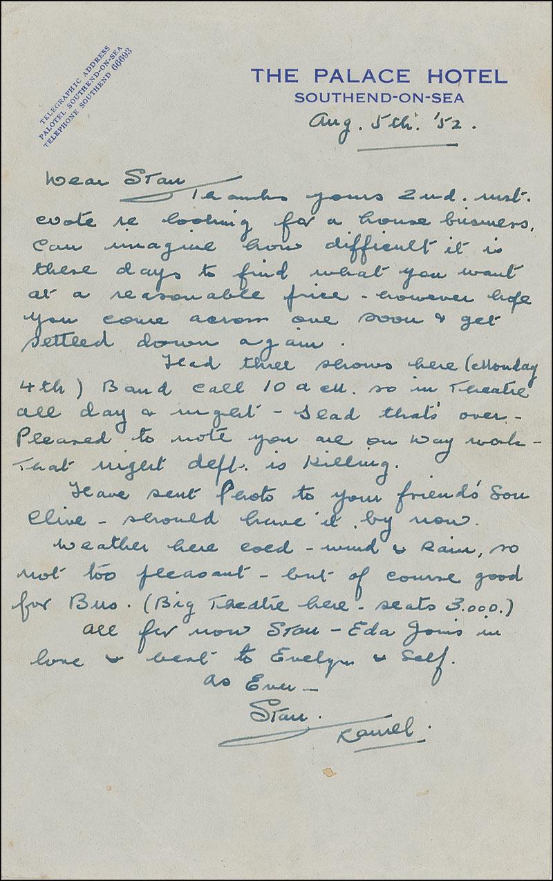 ALS signed “Stan,” one page, 5 x 8, Palace Hotel letterhead, August 5, 1952. Letter to Stan Annison. In part: “Had three shows here (Monday 4th) Band call 10 am, so in theatre all day & night-glad that’s over…Weather here cold-wind & rain, no not too pleasant-but of course good for Bus. (Big Theatre here, seats 3000).” A bit of scattered light toning and soiling, otherwise fine condition. Accompanied by the original mailing envelope, addressed in Laurel’s hand.