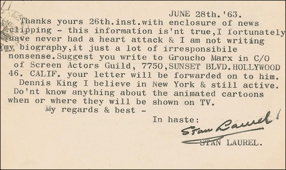 TLS, on a 5.5 x 3.25 postcard, June 28, 1963. Letter to an admirer. In part: “I fortunately have never had a heart attack & am not writing my biography. It is just a lot of irresponsible nonsense. Suggest you write to Groucho Marx…your letter will be forwarded to him…Don’t know anything about the animated cartoons when or where they will be shown on TV.” In fine condition, with small brush to signature and small postmark to top left corner.