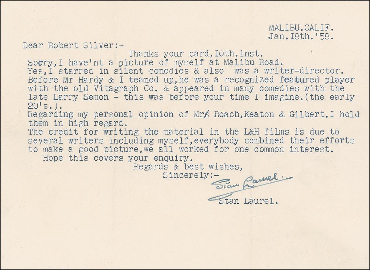 TLS, one page, 8.25 x 6, January 18, 1958. Letter to Robert Silver. In full: “Thanks your card 10th inst. Sorry, I haven’t a picture of myself at Malibu Road. Yes, I starred in silent comedies & also was a writer-director. Before Mr. Hardy & I teamed up, he was a recognized featured player with the old Vitagraph Co. & appeared in many comedies with the late Larry Semon – this was before your time I imagine. (the early 20’s.). Regarding my personal opinion of Mr. Roach, Keaton & Gilbert, I hold them in high regard. The credit for writing material in the L&H films is due to several writers including myself, everybody combined their efforts to make a good picture, we all worked for one common interest. Hope this covers your enquiry.” In fine condition, with two vertical folds, one through a single letter of signature, and a small tack hole to top left. Accompanied by the original mailing envelope.