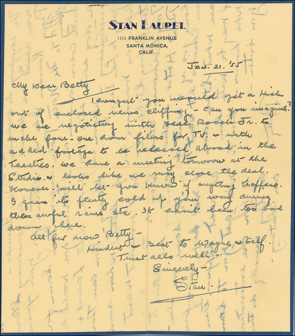 ALS signed “Stan,” one page, 7 x 8, January 21, 1955. Letter to Betty. In part: “…thought you would get a kick out of enclosed news clipping - can you imagine? We are negotiating with Hal Roach Jr to make four one-hour films for TV with added footage to be released abroad in the theatres. We have a meeting tomorrow at the studio & it looks like we may close the deal.” Written on the reverse is Betty’s explanation. In part: “The clipping he enclosed was about our friend Peggy Keenan who is going to the North Pole with color cameras on a dog sled…I also have job if I want it in Casino but want to see what Stan does - I may be with him - who knows.” Central horizontal and vertical fold, and moderate show-through from Betty’s text on reverse, otherwise fine condition.