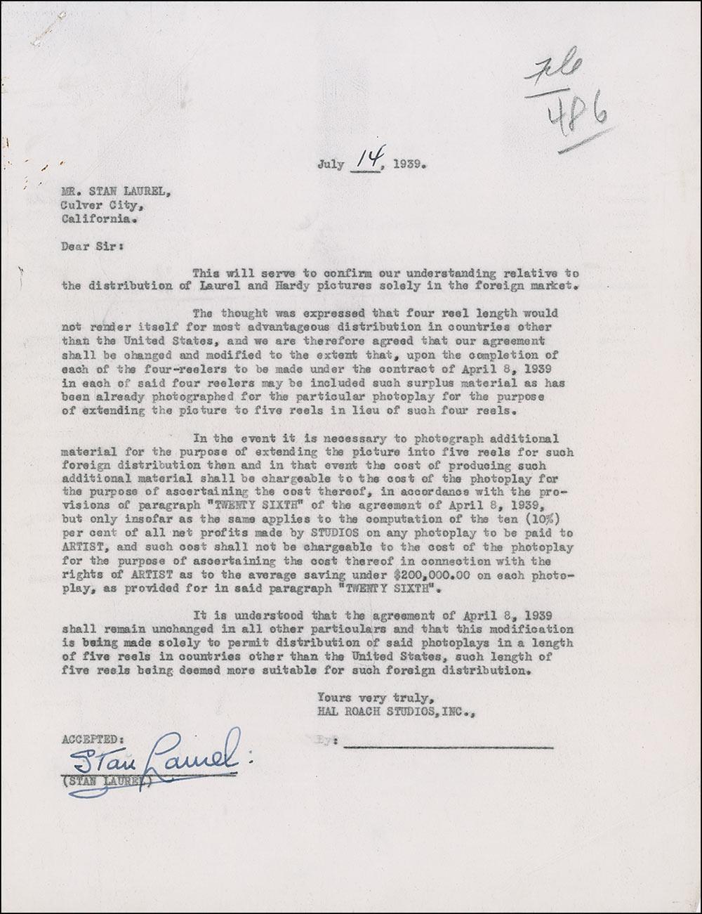 DS, one onionskin page, 8.5 x 11, July 14, 1939. Agreement between Hal Roach Studios and Stan Laurel regarding the distribution of Laurel and Hardy pictures in the foreign market. “This will serve to confirm our understanding relative to the distribution of Laurel and Hardy pictures solely in the foreign market. The thought was expressed that four reel length would not render itself for most advantageous distribution in countries other than the United States, and we are therefore agreed that our agreement shall be changed and modified to the extent that, upon the completion of each of the four-reelers to be made under the contract of April 8, 1939 in each of said four reelers may be included such surplus material as had been already photographed for the particular photoplay for the purpose of extending the picture to five reels in lieu of such four reels.” Nicely signed at the conclusion by Laurel. Several creases and wrinkles, staple hole to top left, and pencil notation to top right, otherwise fine condition. Accompanied by a glossy 8 x 10 photo of an April 8, 1939, letter from Hal Roach Studios to Oliver Hardy concerning his contract and an amendment to it concerning lay-offs; and an unsigned carbon letter on Hal Roach Studios stationery dated December 39, 1939, to Hardy from studio Vice President Frank Ross. An important document as Laurel and Hardy work to become international stars.