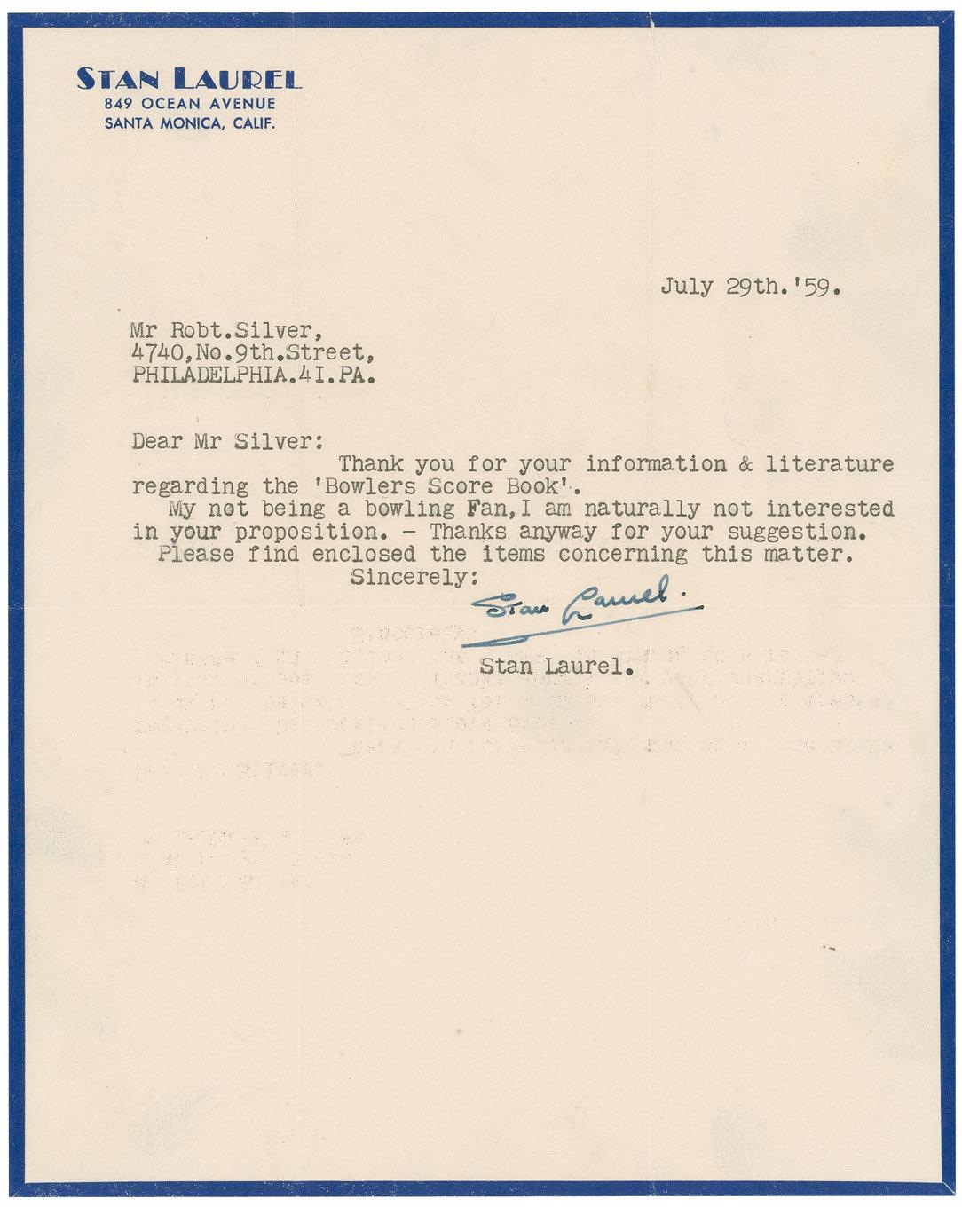 TLS, one page, 8 x 10, personal letterhead, July 29, 1959. Laurel writes Robert Silver of Philadelphia. In full: “Thank you for your information & literature regarding the ‘Bowlers Score Book.’ My not being a bowling fan, I am naturally not interested in your proposition. Thanks anyway for your suggestion. Please find enclosed the items concerning this matter.” Intersecting horizontal and vertical folds passing through the signature, small tear at the top edge, wrinkling, and slight mirroring of the typed text, otherwise fine condition.