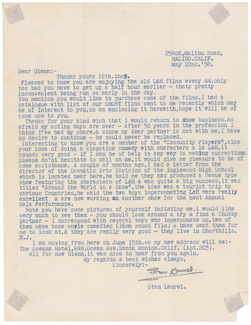 TLS, one page, 8.5 x 11, May 22, 1958. Letter to Glenn Laxton. In part: “Pleased to know you are enjoying the old L&H films every AM, only too bad you have to get up a half hour earlier–that’s pretty inconvenient being run so early in the day. You mention you would like to purchase some of the films. I had a catalogue with list of our SHORT films sent to me recently which may be of interest to you, so am enclosing it herewith, hope it will be of some use to you. Thanks for your kind wish that I would return to show business. Am afraid my acting days are over–after 50 years in the profession I think I’ve had my share, & since my dear partner is not with me, I have no desire to continue–he could never be replaced. Interesting to know you are a member of the ‘Community Players’, also your idea of doing a slapstick comedy with characters a la L&H, it sounds very good–if I can be of help in any way in making suggestions please don’t hesitate to call on me, it would give me pleasure to be of some assistance. A couple of months ago, I had a letter from the director of the Dramatic Arts Division of the Inglewood High School which is located near here, he told me they had produced a Revue type show featuring the characters of L&H & was quite a big success, it was titled ‘Around the World in a Daze’, the idea was a tourist trip to various Countries, he said the two boys impersonating L&H were really excellent & are now working on another show for the next Annual Gala Performance. Note you have some pictures of yourself imitating me, I would like very much to see them–you should look around & try & find a Chubby partner–I correspond with several boys who impersonate us, two of them make home movie comedies (16mm sound film) & have sent them for me to look at, & they are really very good.” Intersecting folds, one through a single letter of signature, missing lower right corner tip, some tape applied to right edge, and show-through from tape remnants on reverse, otherwise fine condition. Accompanied by the original mailing envelope. People who knew Laurel said he was absolutely devastated by Hardy's death and never fully recovered for the rest of his life.