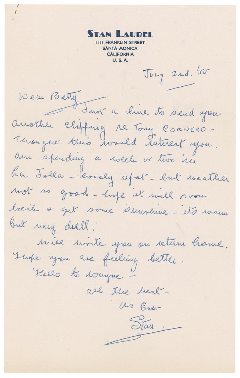 ALS signed “Stan,” one page, 6 x 9.5, personal letterhead, July 2, 1955. Letter to Betty. In part: “Just a line to send you another clipping re Tony Cornero…Am spending a week or two in Lo Jolla…it’s warm but very dull.” In fine condition, with rusty staple mark to top left.