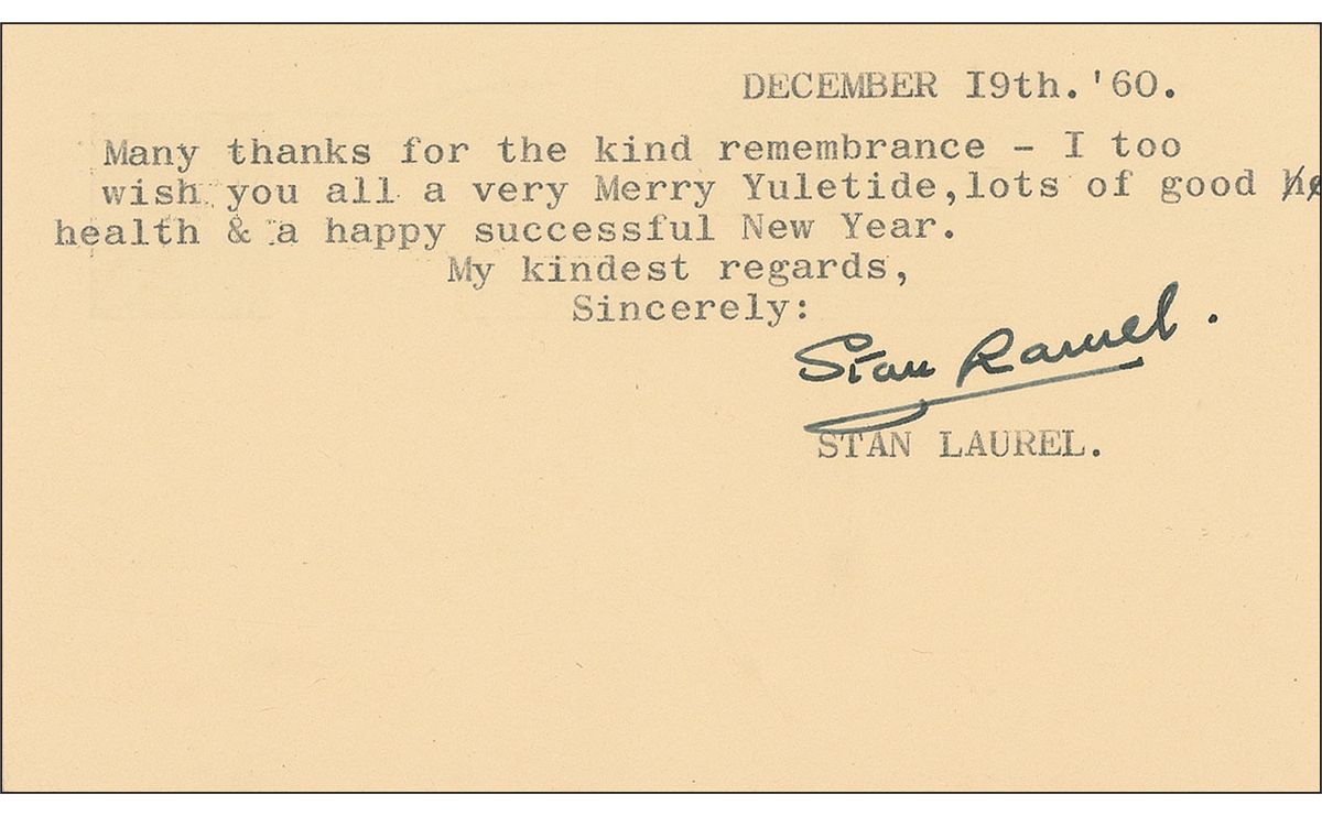 Brief TLS on the reverse of a beige 5.5 x 3.25 government postcard, December 19, 1960. Laurel writes to John Perrie of Old Saybrook, Connecticut, in full: “Many thanks for the kind remembrance—I too wish you all a very Merry Yuletide, lots of good health & a happy successful New Year,” signing at the conclusion in black felt tip. In fine condition.