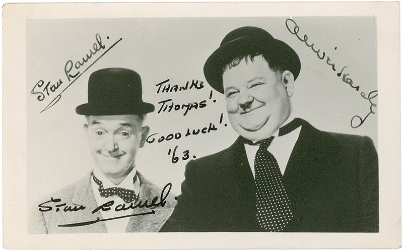 Jubilant matte-finish 5.5 x 3.5 publicity photo of the comedic icons, signed and inscribed in fountain pen, “Thanks Thomas! Good Luck! ‘63. Stan Laurel,” featuring facsimile signatures for Laurel and Hardy. In fine condition.