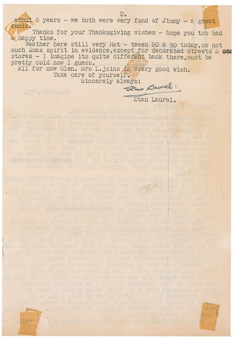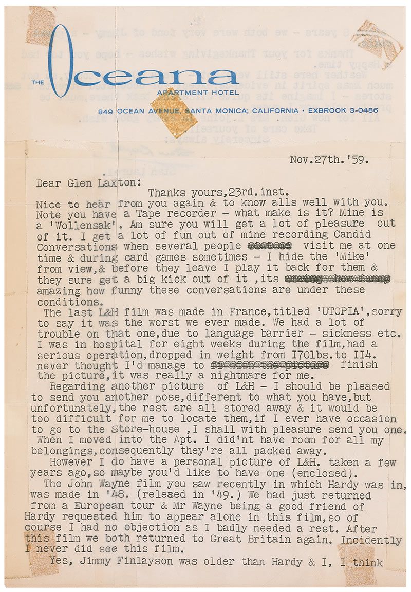 TLS, one page both sides, 7.25 x 10.5, Oceana letterhead, November 27, 1959. Letter to Glen Laxton. In part: “Note you have a Tape recorder—what make is it? Mine is a ‘Wollensak.’ Am sure you will get a lot of pleasure out of it. I get a lot of fun out of mine recording Candid Conversations when several people visit me at one time & during card games sometimes—I hide the ‘Mike’ from view, & before they leave I play it back for them & they sure get a big kick out of it, its amazing how funny these conversations are under these conditions. The last L&H film was made in France, titled ‘UTOPIA’, sorry to say it was the worst we ever made. We had a lot of trouble on that one, due to language barrier—sickness etc. I was in hospital for eight weeks during the film, had a serious operation, dropped in weight from 170 lbs. to 114. never thought I’d manage to finish the picture, it was really a nightmare for me…The John Wayne film you saw recently in which Hardy was in, was made in ’48. (released in ’49.) We had just returned from a European tour & Mr Wayne being a good friend of Hardy requested him to appear alone in this film, so of course I had no objection as I badly needed a rest. After this film we both returned to Great Britain again. Incidently I never did see this film. Yes, Jimmy Finlayson was older than Hardy & I, I think about 8 years—we both were very fond of Jimmy—a great comic.” In good condition, with large tape repairs to separations and tears, trimmed edges, some small blocks of toning from old tape, and some light toning and tape over portion of signature. Accompanied by the original mailing envelope.