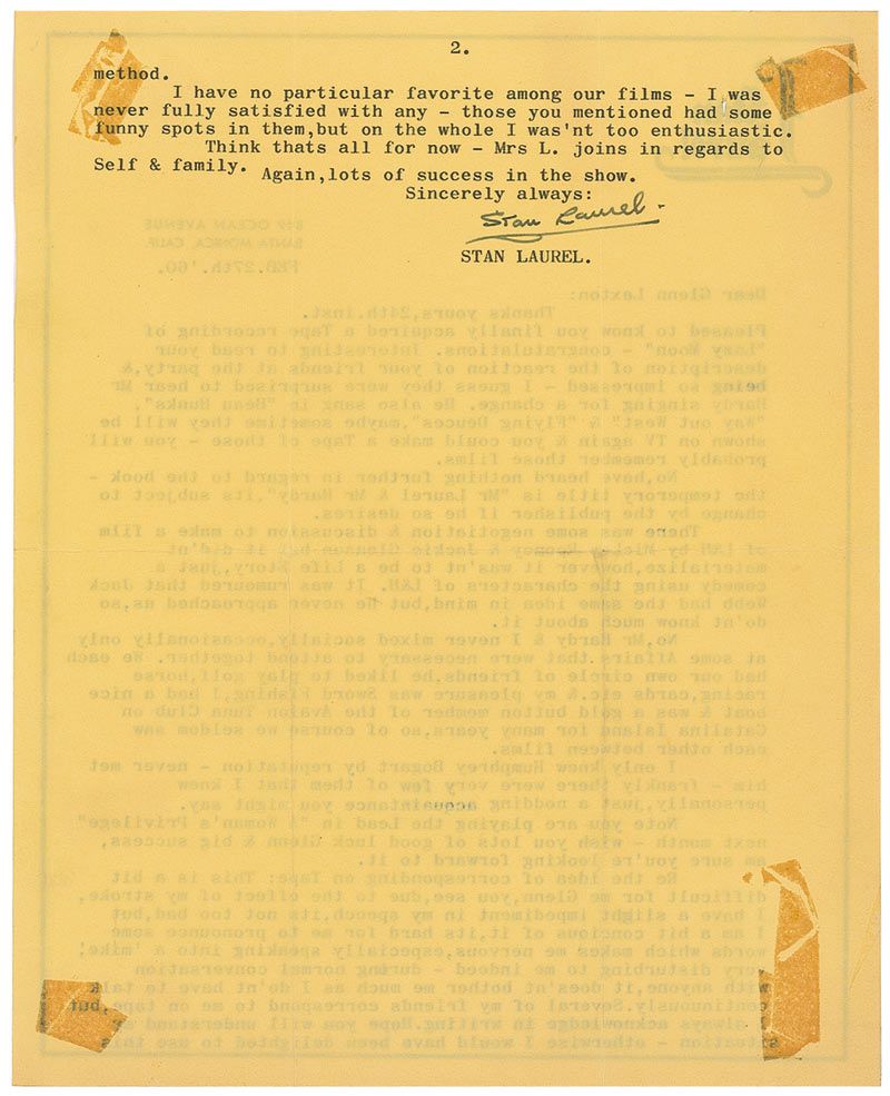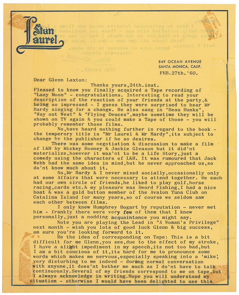 TLS, one page both sides, 8 x 10, personal letterhead, February 27, 1960. Letter to Glenn Laxton. In part: “Interesting to read your description of the reaction of your friends at the party, & being so impressed–I guess they were surprised to hear Mr Hardy singing for a change. He also sang in ‘Beau Hunks’, ‘Way out West’ & ‘Flying Deuces’, maybe sometime they will be shown on TV again & you could make a Tape of those–you will probably remember those films…There was some negotiation & discussion to make a film of L&H by Mickey Rooney & Jackie Gleason but it did’nt [sic] materialize, however if was’nt [sic] to be a Life Story, just a comedy using the characters of L&H. It was rumoured that Jack Webb had the same idea in mind, but he never approached us, so don’t know much about it…No, Mr Hardy & I never mixed socially, occasionally only at some Affairs that were necessary to attend together. We each had our own circle of friends, he liked to play golf, horse racing, cards etc. & my pleasure was Sword Fishing, I had a nice boat & was a gold button member of the Avalon Tuna Club on Catalina Island for many years, so of course we seldom saw each other between films. I only knew Humphrey Bogart by reputation–never met him–frankly there were very few of them that I knew personally, just a nodding acquaintance you might say.” In very good condition, with old tape repairs to folds and edges, some corner toning from tape, and intersecting folds, one through a single letter of signature. Accompanied by the original mailing envelope. An exceptional letter chock full of Laurel and Hardy and Hollywood content.