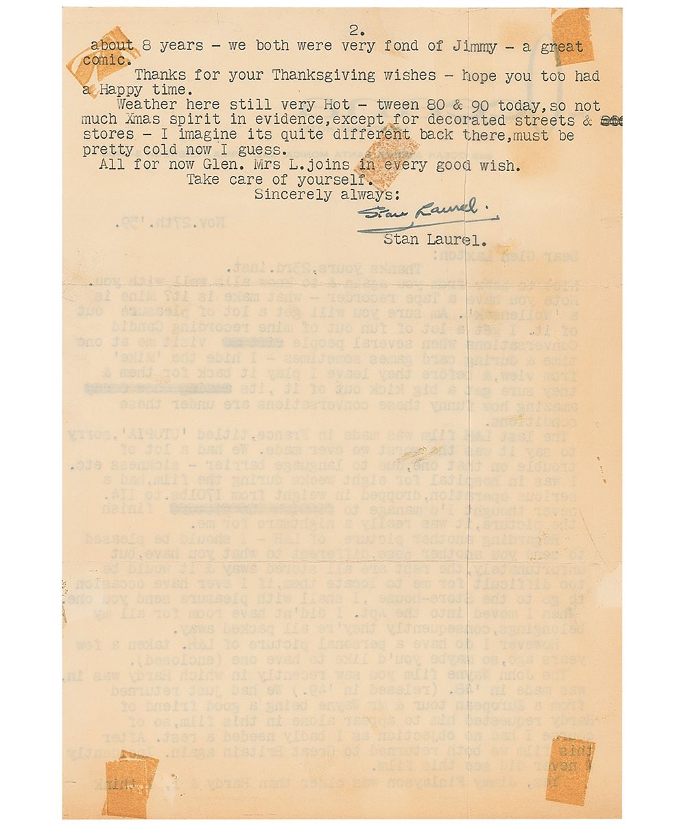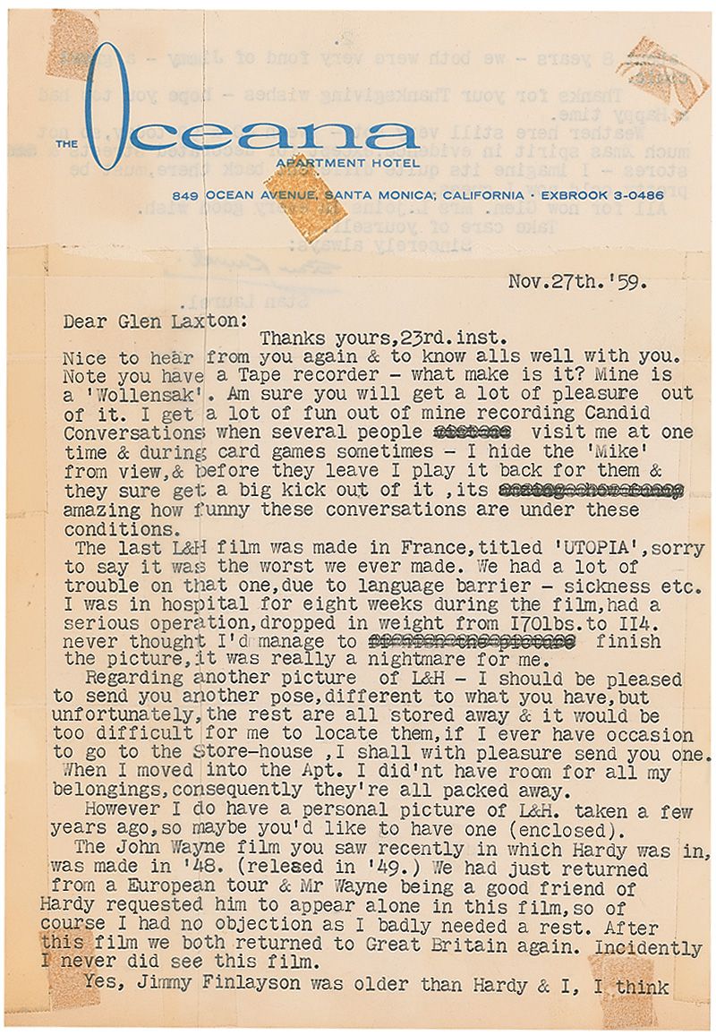 TLS, one page both sides, 7.25 x 10.5, Oceana letterhead, November 27, 1959. Letter to Glen Laxton. In part: “The last L&H film was made in France, titled ‘UTOPIA’, sorry to say it was the worst we ever made. We had a lot of trouble on that one, due to language barrier—sickness etc. I was in hospital for eight weeks during the film, had a serious operation, dropped in weight from 170 lbs. to 114. Never thought I’d manage to finish the picture, it was really a nightmare for me…The John Wayne film you saw recently in which Hardy was in, was made in ’48. (released in ’49.) We had just returned from a European tour & Mr. Wayne being a good friend of Hardy requested him to appear alone in this film, so of course I had no objection as I badly needed a rest. After this film we both returned to Great Britain again. Incidently I never did see this film. Yes, Jimmy Finlayson was older than Hardy & I, I think about 8 years—we both were very fond of Jimmy—a great comic.” In good condition, with large tape repairs to separations and tears, trimmed edges, some small blocks of toning from old tape, and some light toning and tape over portion of signature. Accompanied by the original mailing envelope.