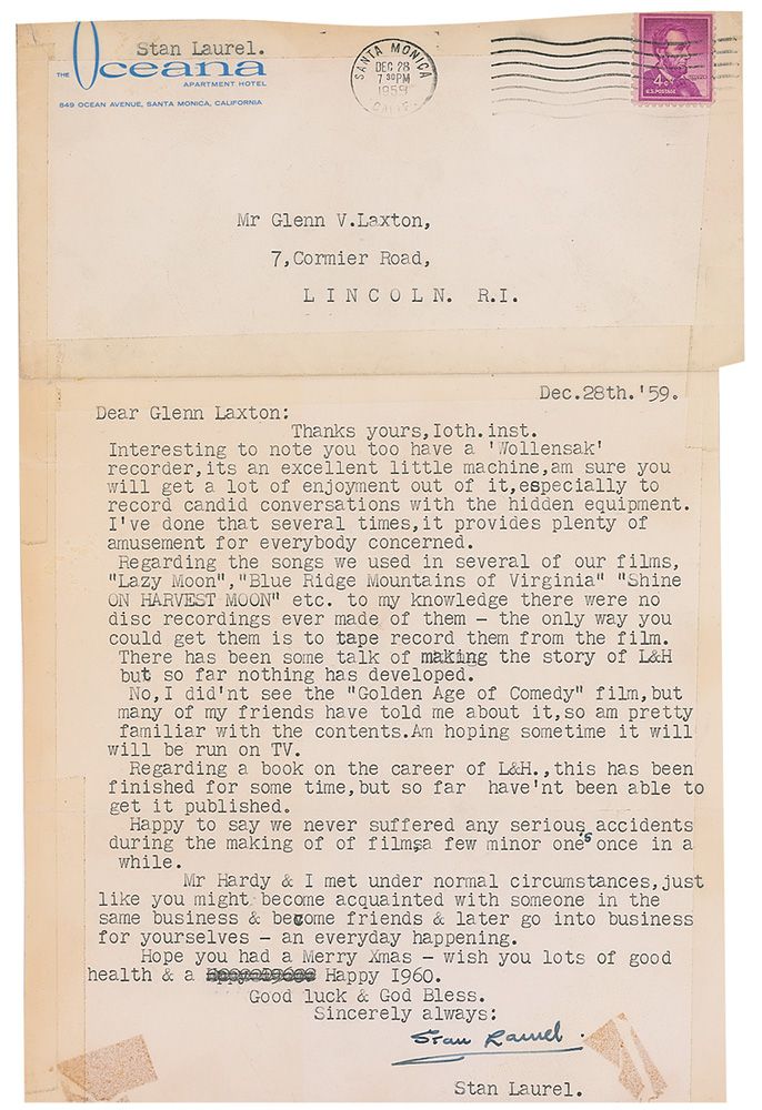 TLS, one page, 7.25 x 10, Oceana letterhead, December 28, 1959. Letter to an admirer. In part: “Regarding the songs we used in several of our films, 'Lazy Moon,’ 'Blue Ridge Mountains of Virginia,' 'Shine on Harvest Moon,' etc. to my knowledge there were no disc recordings ever made of them—the only way you could get them is to tape record them from the film. There has been some talk of making the story of L&H but so far nothing has developed. No, I did'nt [sic] see the 'Golden Age of Comedy' film, but many of my friends have told me about it, so am pretty well familiar with the contents…Regarding a book on the career of L&H, this has been finished for some time, but so far have'nt [sic] been able to get it published. Happy to say we never suffered any serious accidents during the making of the films, a few minor ones once in a while.” The original mailing envelope is affixed by tape to the upper portion of the letter. In very good condition, with tape to edges of letter, scattered toning, and two blocks of old tape toning at bottom.