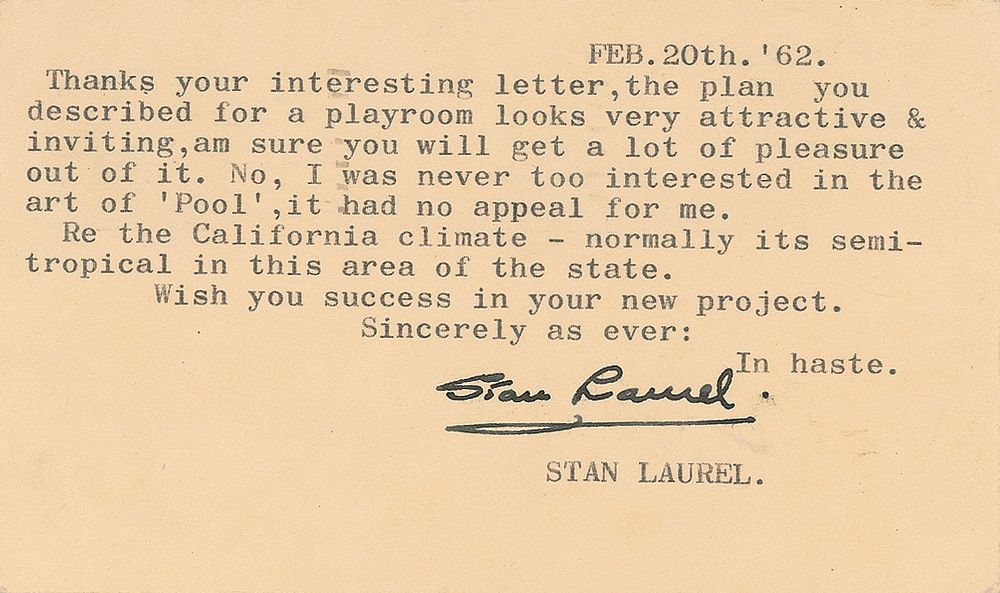 TLS, one page, 5.5 x 3.25, February 20, 1962. Letter to an admirer. In part: “The plan you described for a playroom looks very attractive…I was never too interested in the art of ‘Pool,’ it had no appeal for me.” In fine condition.