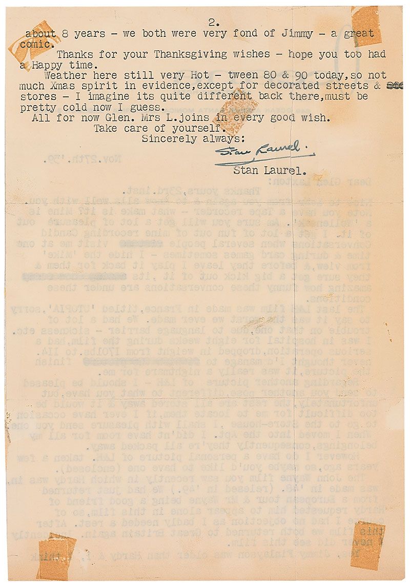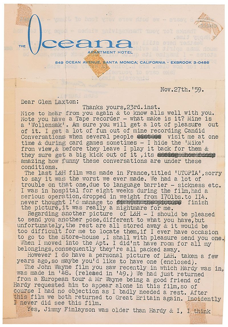 TLS, one page both sides, 7.25 x 10.5, Oceana letterhead, November 27, 1959. Letter to Glen Laxton. In part: “The last L&H film was made in France, titled ‘UTOPIA’, sorry to say it was the worst we ever made. We had a lot of trouble on that one, due to language barrier—sickness etc. I was in hospital for eight weeks during the film, had a serious operation, dropped in weight from 170 lbs. to 114. Never thought I’d manage to finish the picture, it was really a nightmare for me…The John Wayne film you saw recently in which Hardy was in, was made in ’48. (released in ’49.) We had just returned from a European tour & Mr. Wayne being a good friend of Hardy requested him to appear alone in this film, so of course I had no objection as I badly needed a rest. After this film we both returned to Great Britain again. Incidently I never did see this film. Yes, Jimmy Finlayson was older than Hardy & I, I think about 8 years—we both were very fond of Jimmy—a great comic.” In good condition, with large tape repairs to separations and tears, trimmed edges, some small blocks of toning from old tape, and some light toning and tape over portion of signature. Accompanied by the original mailing envelope.