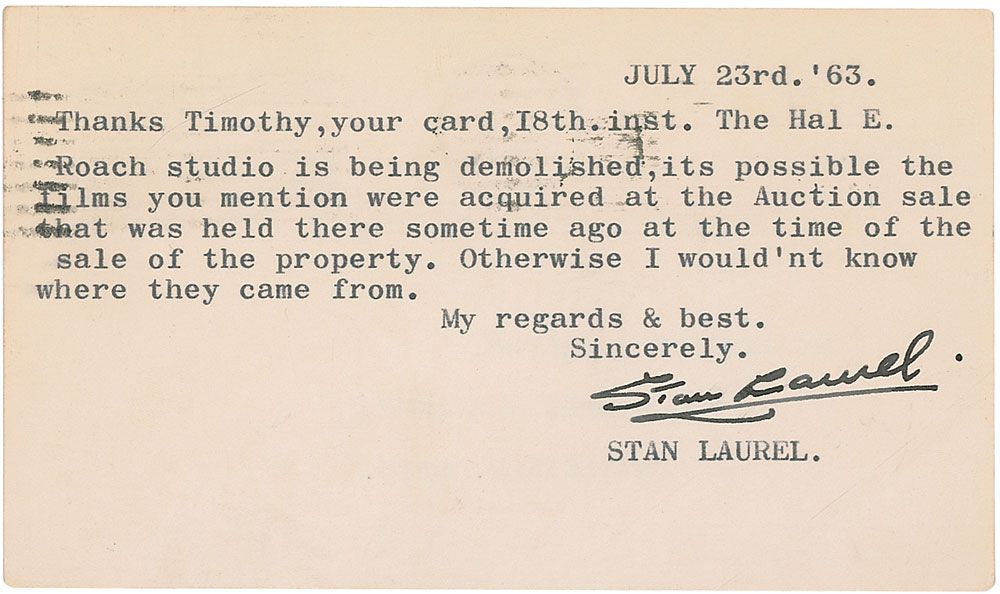 TLS, on a 5.5 x 3 postcard, July 23, 1963. In part: “The Hal E. Roach studio is being demolished, it’s possible the films you mention were acquired at the Auction sale that was held there sometime ago at the time of the sale of the property.” In fine condition, with postal cancellations over a few words of text and a light impression from cancellation on reverse.