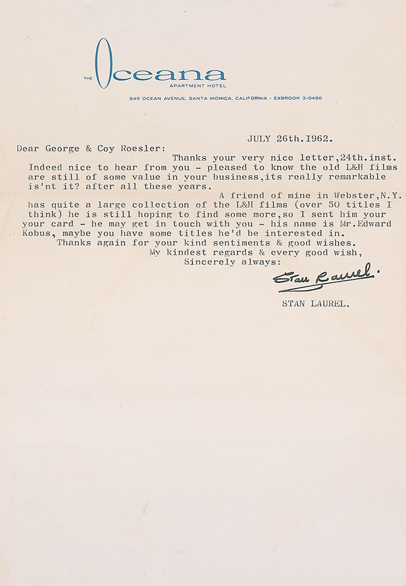 TLS, one page, 7.25 x 10.5, Oceana Apartment Hotel letterhead, July 26, 1962. Letter to George Roesler. In part: “Pleased to know the old L&H films are still of some value in your business, it’s really remarkable isn’t it? after all these years. A friend of mine in Webster, N. Y. has quite a large collection of the L&H films (over 50 titles I think) he is still hoping to find some more, so I sent him your card.” In fine condition. Accompanied by the original mailing envelope.