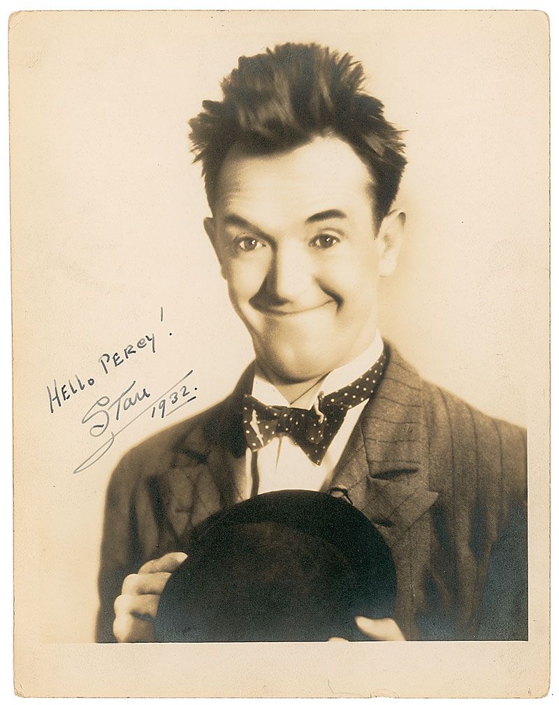 Vintage matte-finish 7.75 x 10 portrait of Laurel holding his bowler hat, signed and inscribed in fountain pen, “Hello Percy! Stan, 1932.” Reverse bears a Stax photographer’s stamp. In fine condition, with scattered dings and creases to edges.