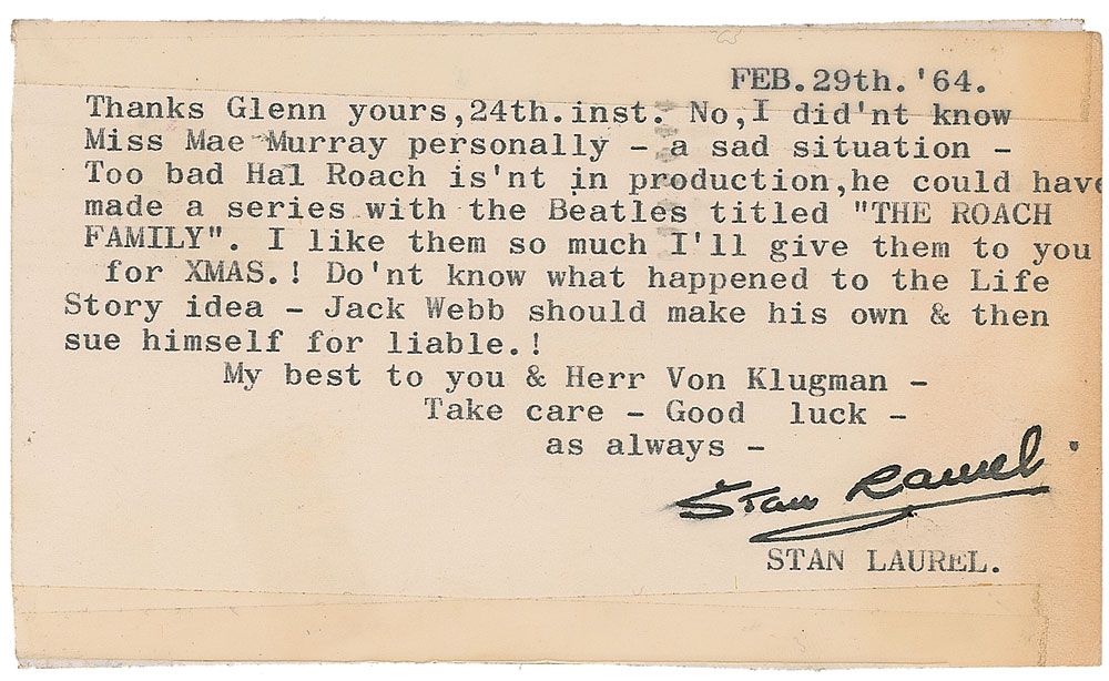 TLS, on a 5.5 x 3.25 government postcard, February 29, 1964. Letter to Senator Glenn Laxton in Boston. In part: “Too bad Hal Roach isn’t in production, he could have made a series with the Beatles titled ‘The Roach Family.’ I like them so much I’ll give them to you for XMAS! Don’t know what happened to the Life Story idea—Jack Webb should make his own & then sue himself for liable!” In very good condition, with old tape to horizontal edges, a couple light brushes to signature, scattered toning, and a PSA/DNA authentication label affixed to reverse.