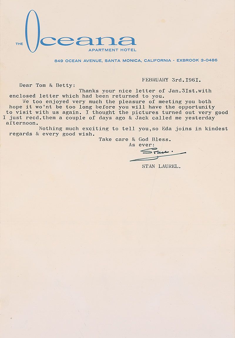 TLS signed “Stan,” one page, 7.25 x 10.5, personal letterhead, February 3, 1961. Letter to Tom Jackson of Los Angeles. In part: “We too enjoyed very much the pleasure of meeting you both hope it won’t be too long before you will have the opportunity to visit with us again. I thought the pictures turned out very good I just recd. them a couple of days ago.” In fine condition. Accompanied by the original mailing envelope and an unsigned candid snapshot of Laurel with others (presumably one referenced in the letter).
